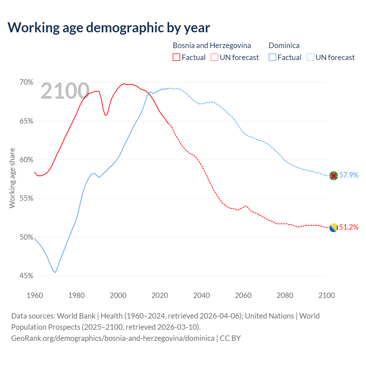 - Bosnia and Herzegovina has 2.02M working age adults (aged 15-64) vs 45.3K in Dominica.