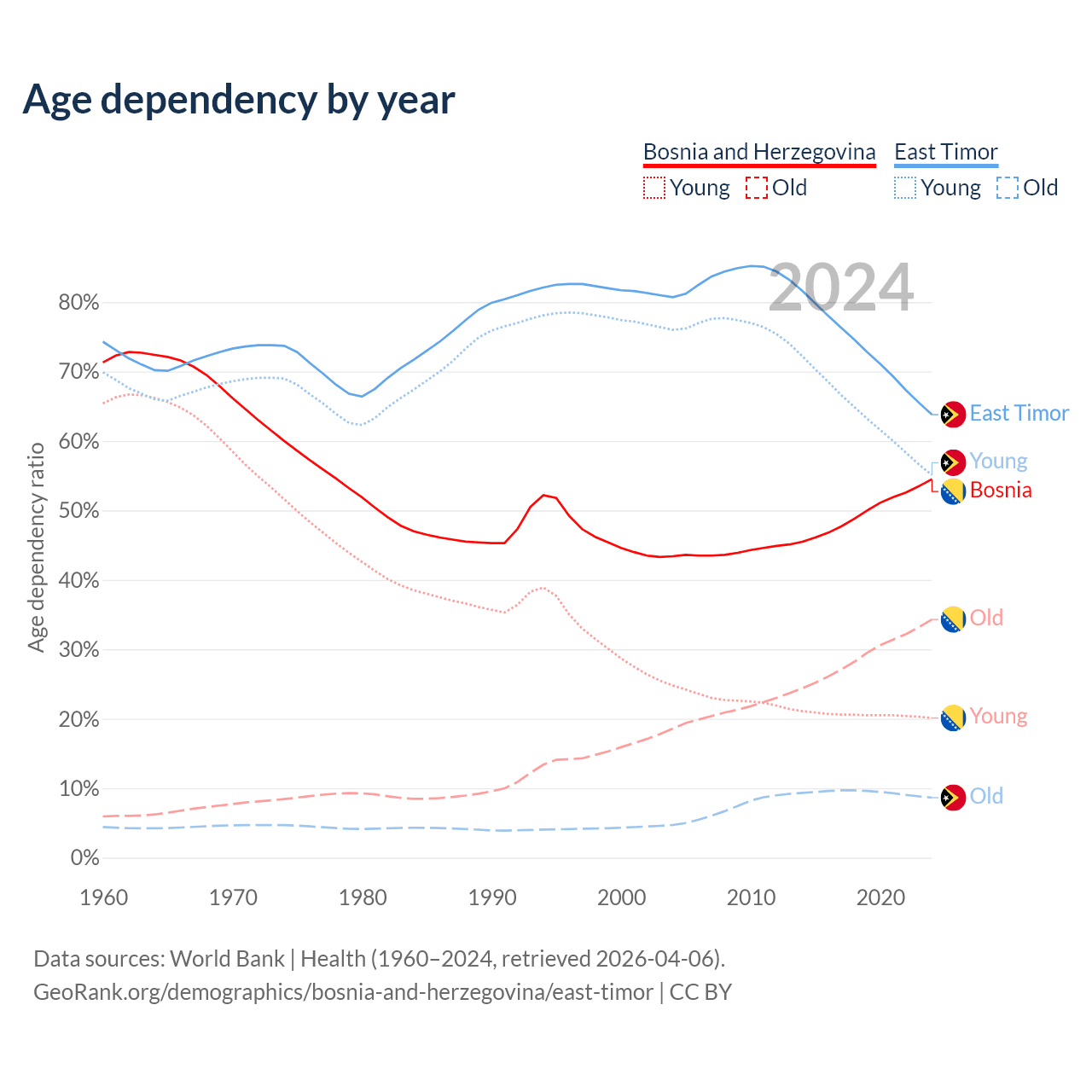 - The share of old-age demographic (65+) in Bosnia and Herzegovina is 22.2% vs 5.28% in East Timor.