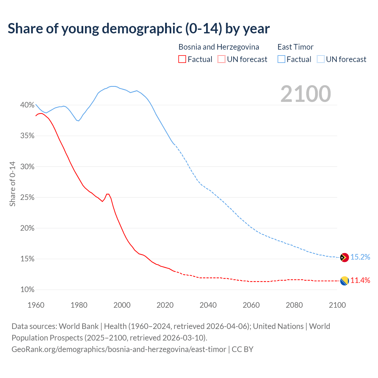 - The share of young demographic (0-15 years old) in Bosnia and Herzegovina is 13% vs 33.7% in East Timor.