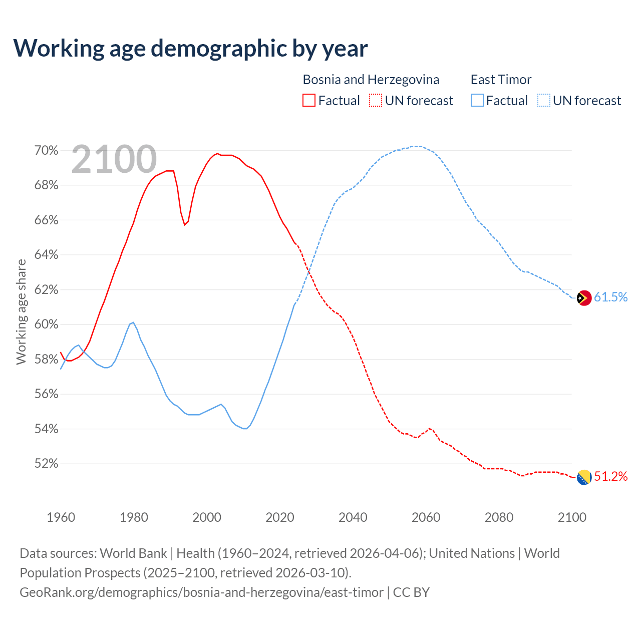 - Bosnia and Herzegovina has 2.02M working age adults (aged 15-64) vs 880K in East Timor.