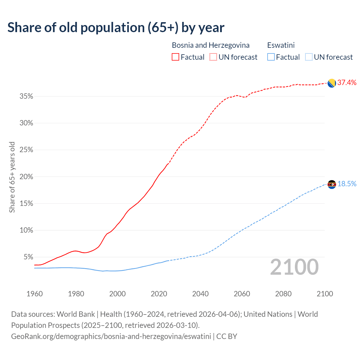 - The share of old-age demographic (65+) in Bosnia and Herzegovina is 22.2% vs 4.26% in Eswatini.