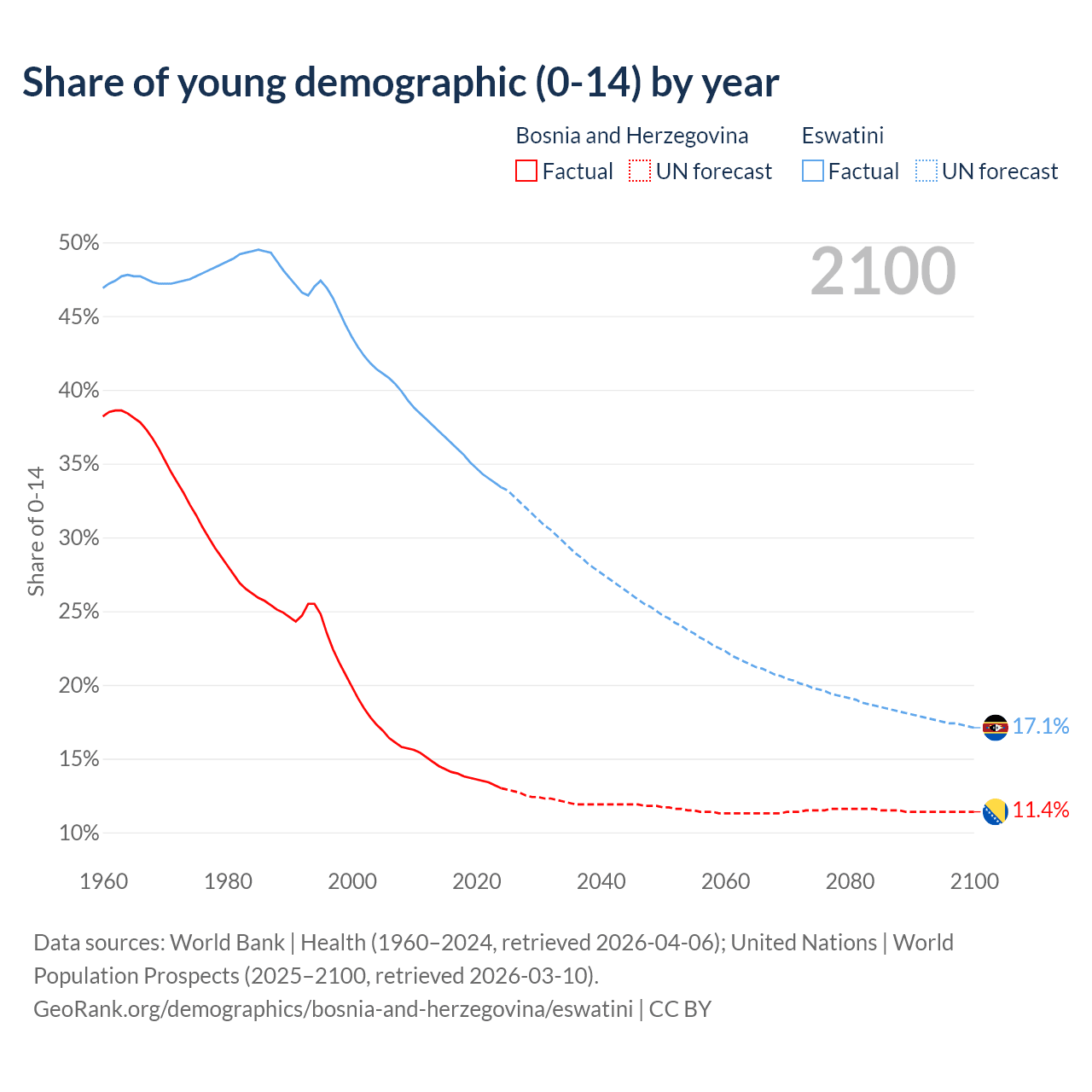 - The share of young demographic (0-15 years old) in Bosnia and Herzegovina is 13% vs 33.4% in Eswatini.