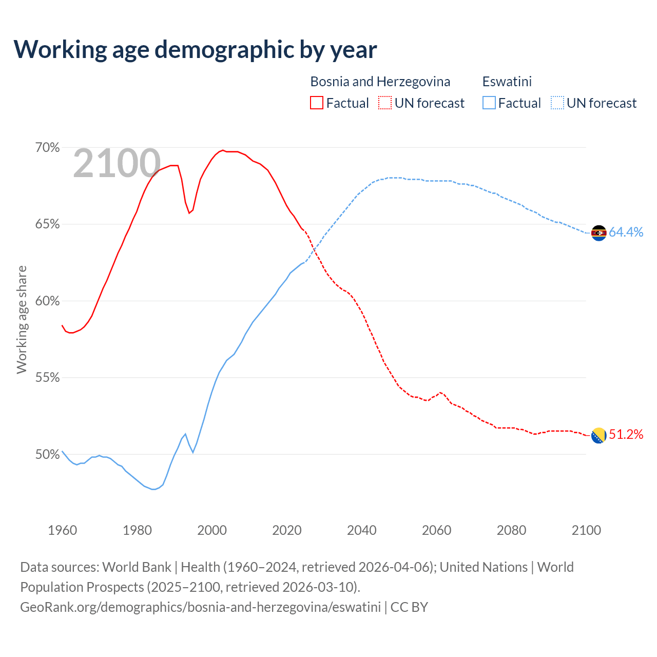 - Bosnia and Herzegovina has 2.02M working age adults (aged 15-64) vs 794K in Eswatini.