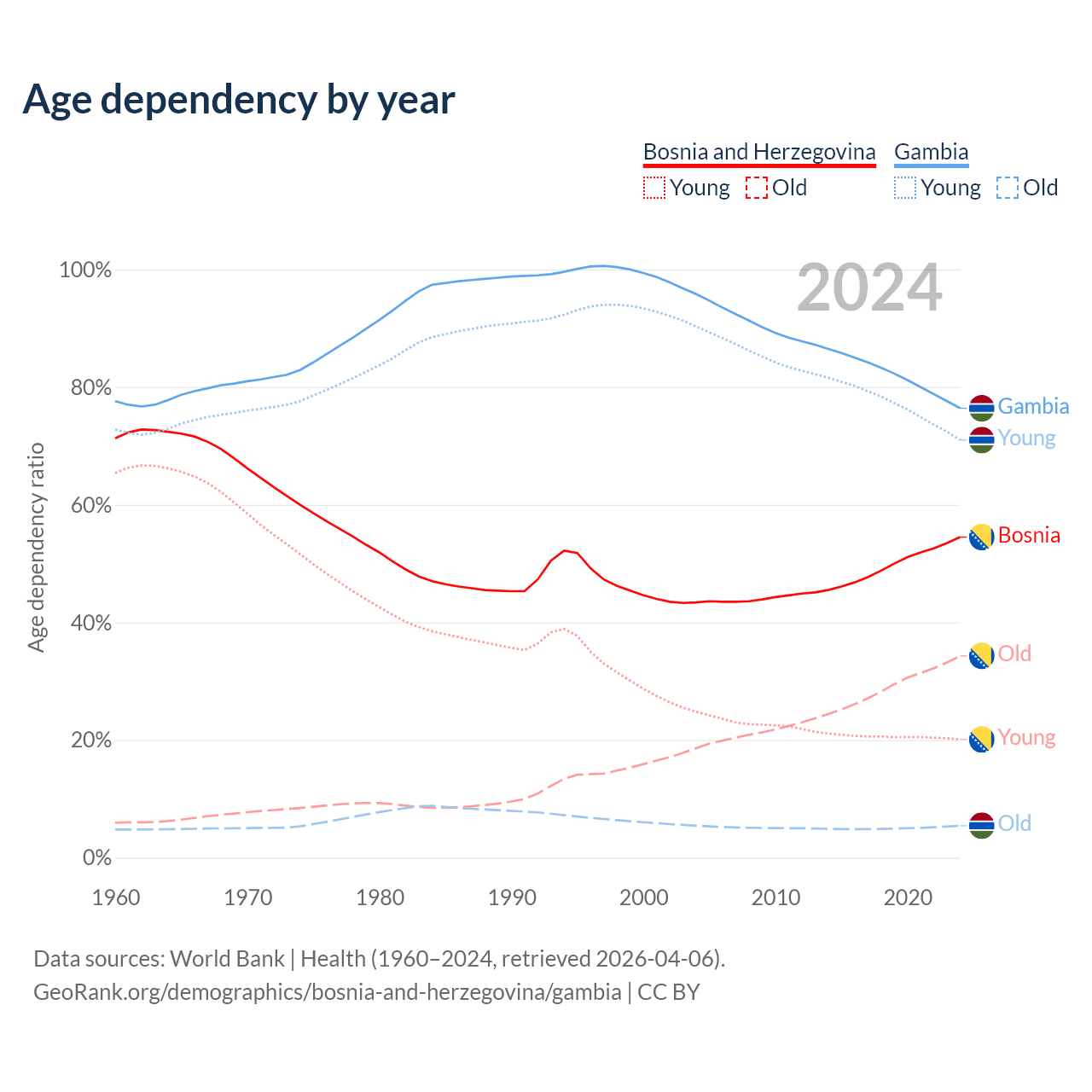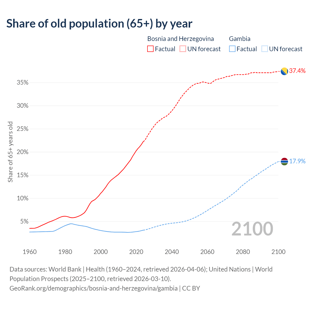 - The share of old-age demographic (65+) in Bosnia and Herzegovina is 22.2% vs 3.08% in the Gambia.