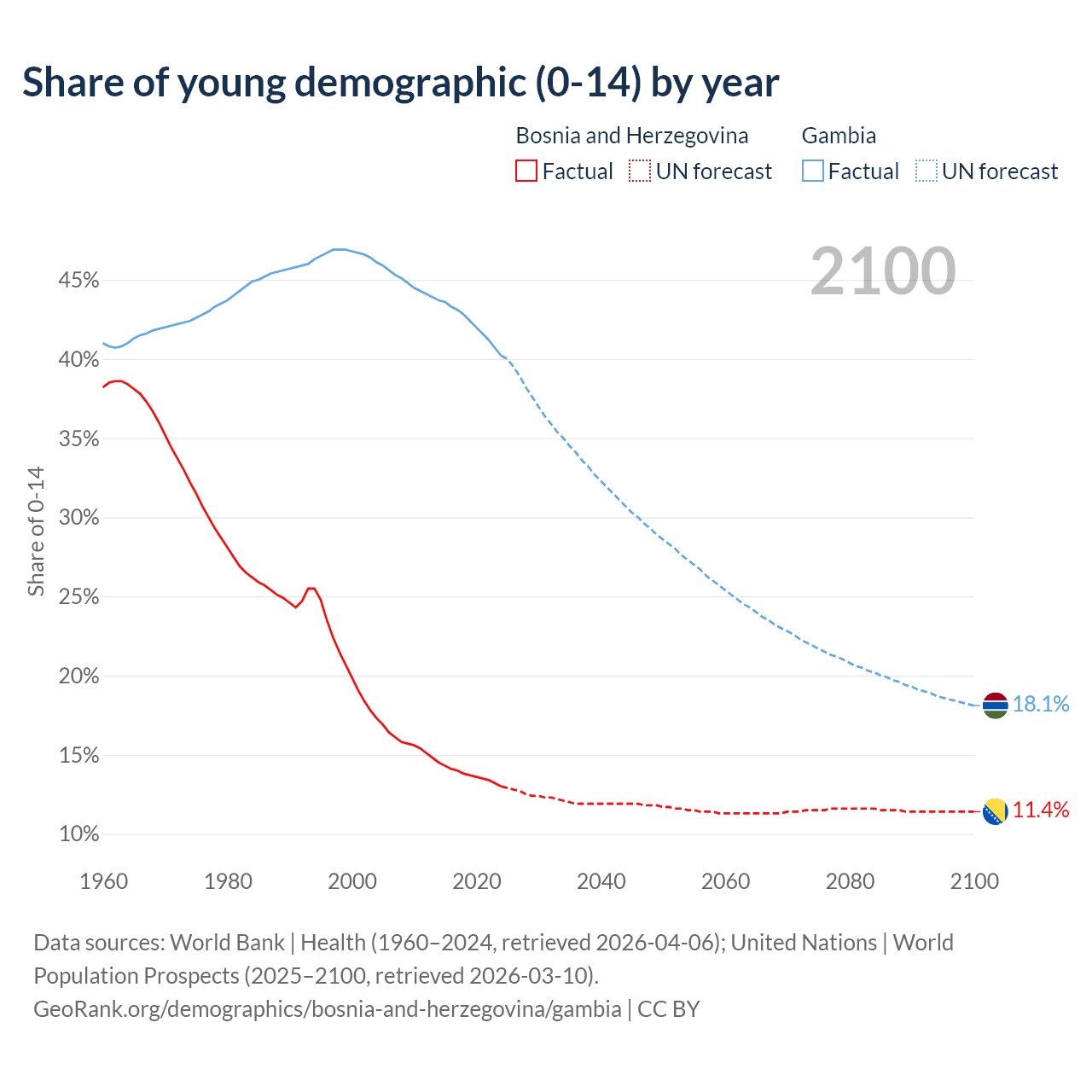 - The share of young demographic (0-15 years old) in Bosnia and Herzegovina is 13% vs 40.2% in the Gambia.