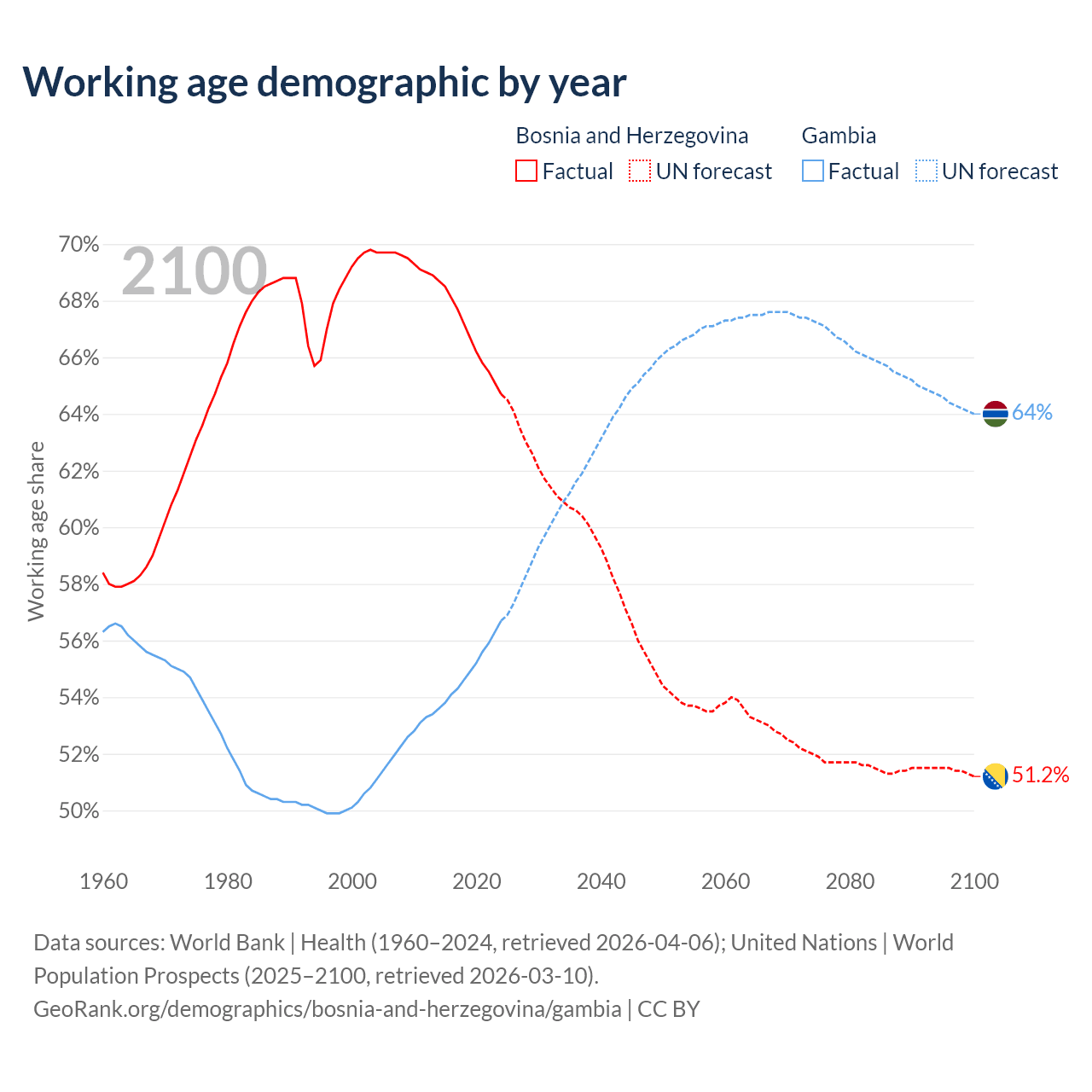 - Bosnia and Herzegovina has 2.02M working age adults (aged 15-64) vs 1.64M in the Gambia.
