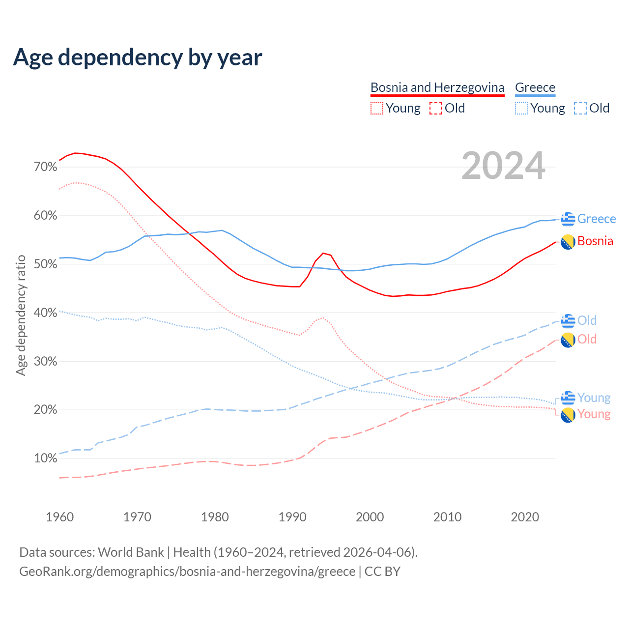 - Bosnia and Herzegovina is ranked 8/196 by median age (oldest to youngest) vs 6/196 for Greece.