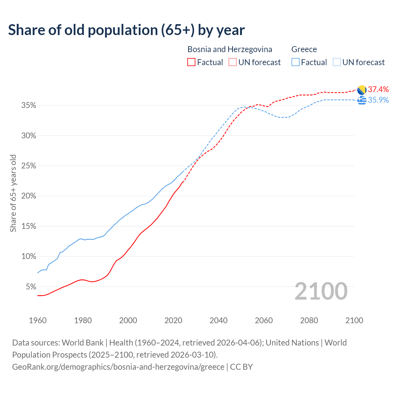 The share of older people aged 65 and over is 22.2% in Bosnia and Herzegovina and 23.9% in Greece. Life expectancy in Bosnia and Herzegovina compared to Greece .