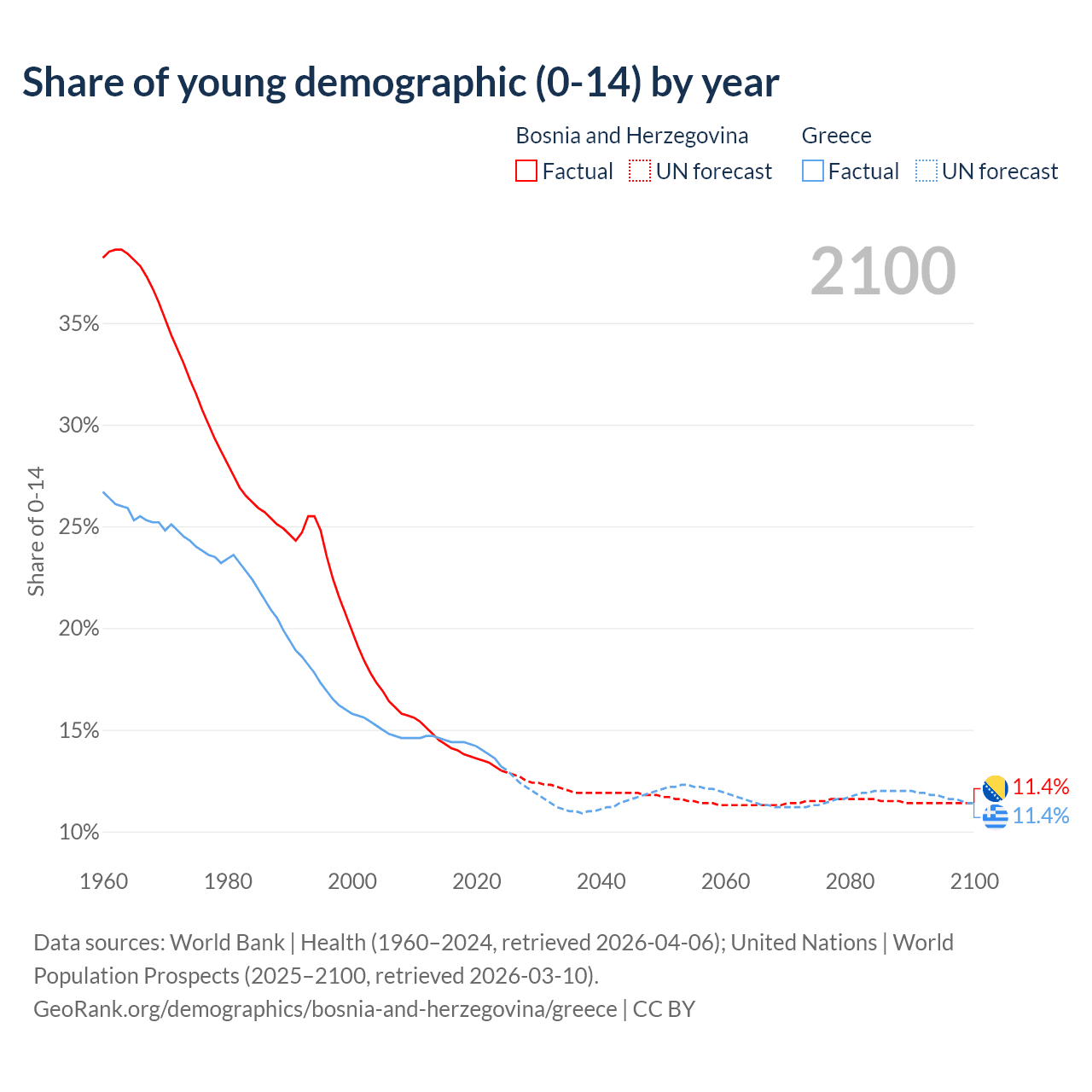 - The share of young demographic (0-15 years old) in Bosnia and Herzegovina is 13% vs 13.2% in Greece.