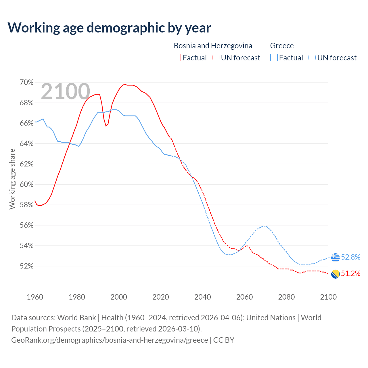 - Bosnia and Herzegovina has 2.02M working age adults (aged 15-64) vs 6.4M in Greece.