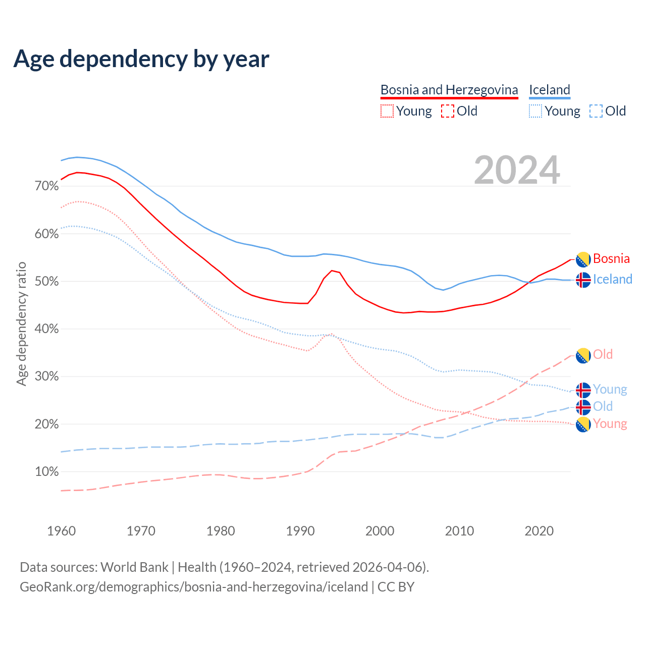 - The share of old-age demographic (65+) in Bosnia and Herzegovina is 22.2% vs 15.6% in Iceland.
