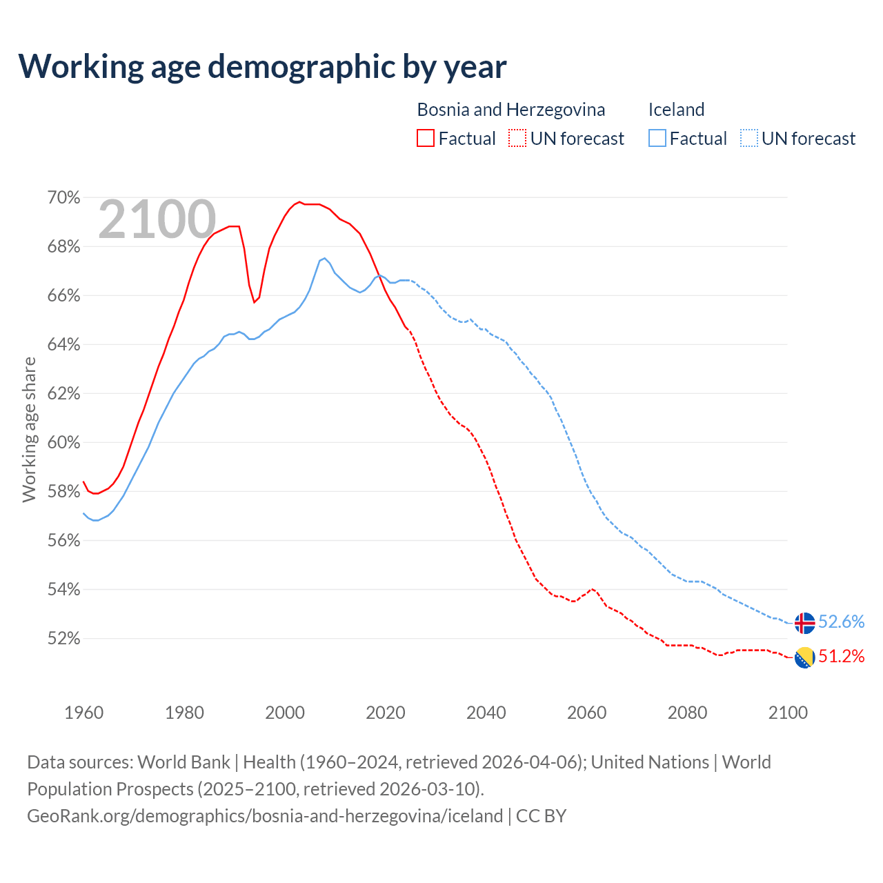 Median age Bosnia and Herzegovina vs Iceland, 1960-2100