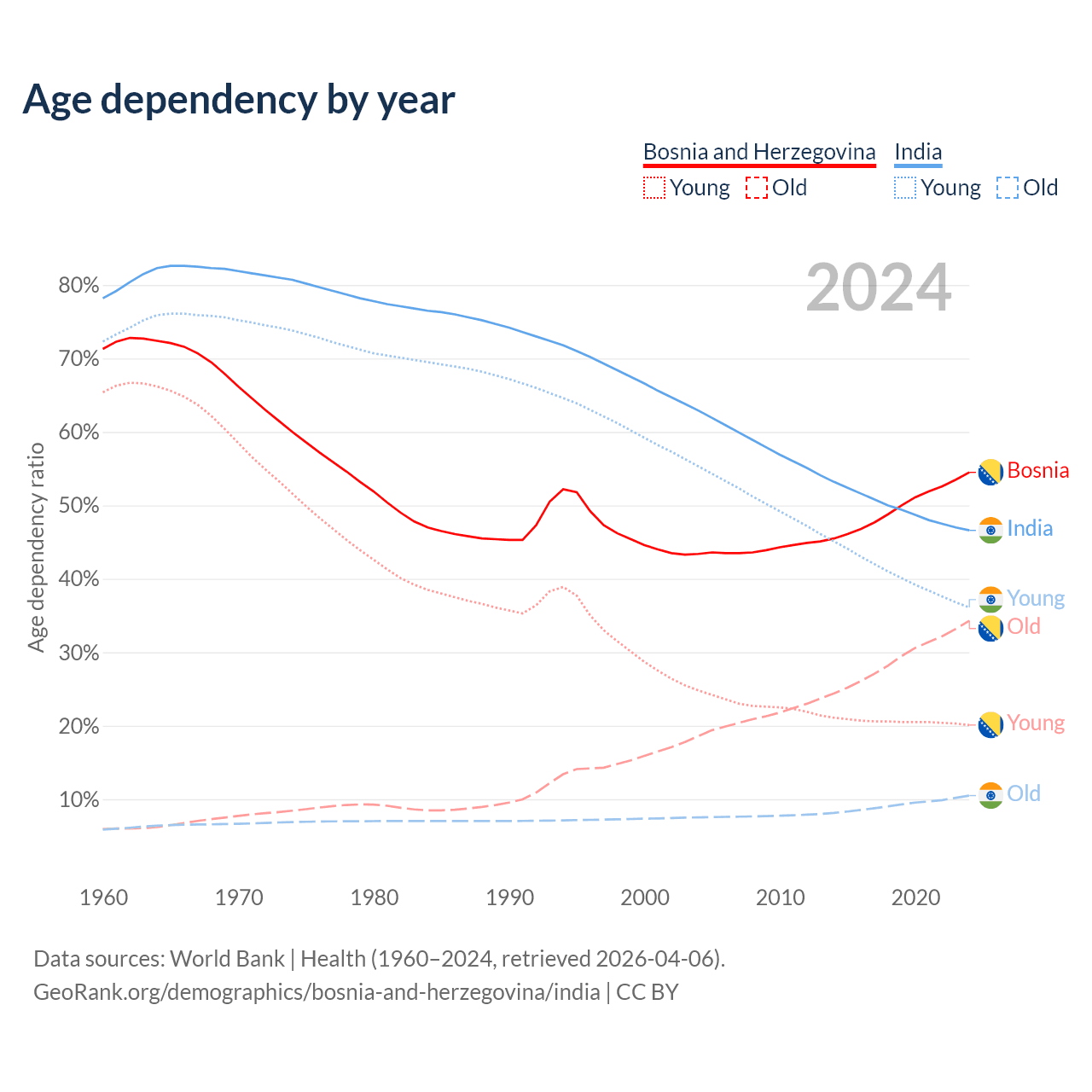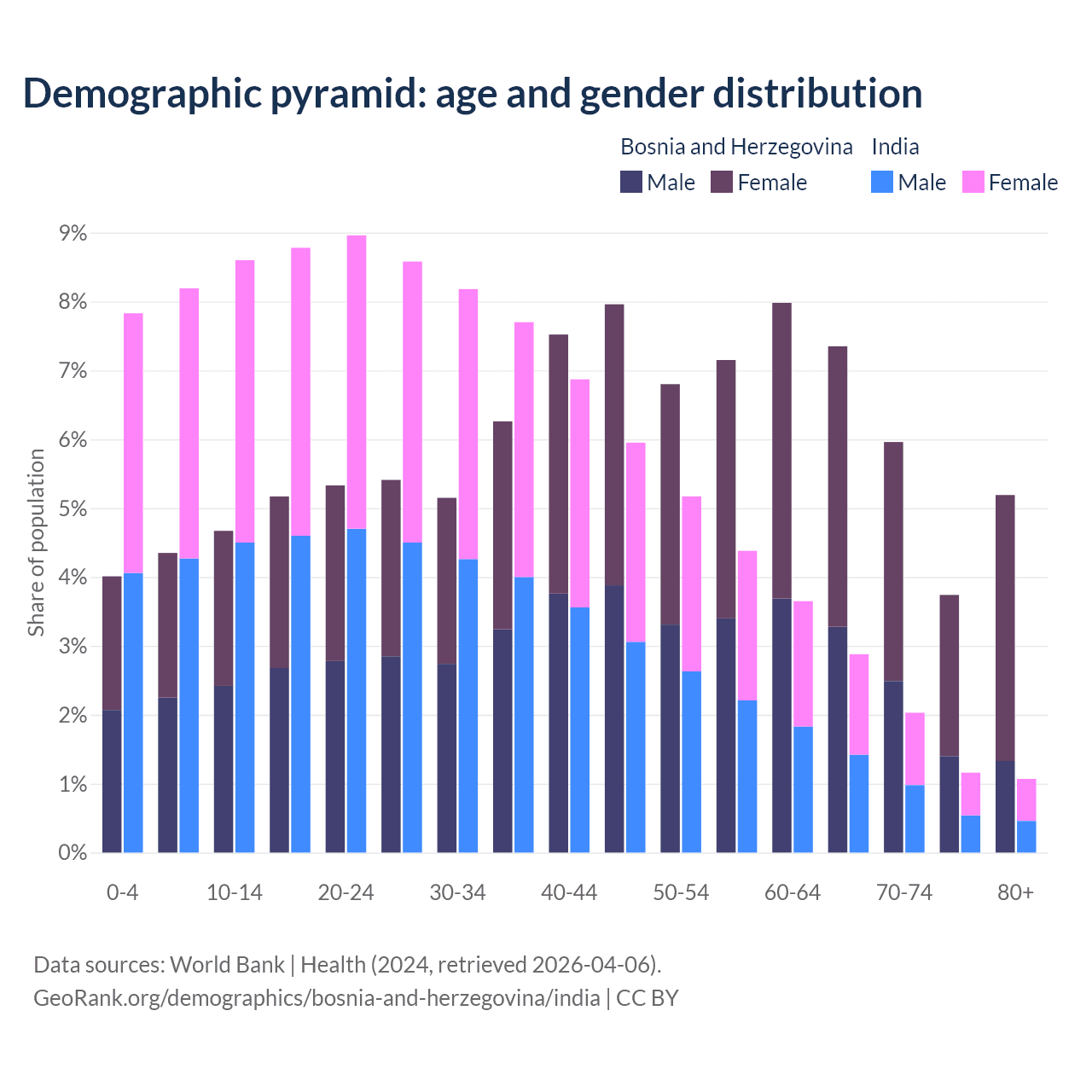 - Bosnia and Herzegovina is ranked 8/196 by median age (oldest to youngest) vs 108/196 for India.