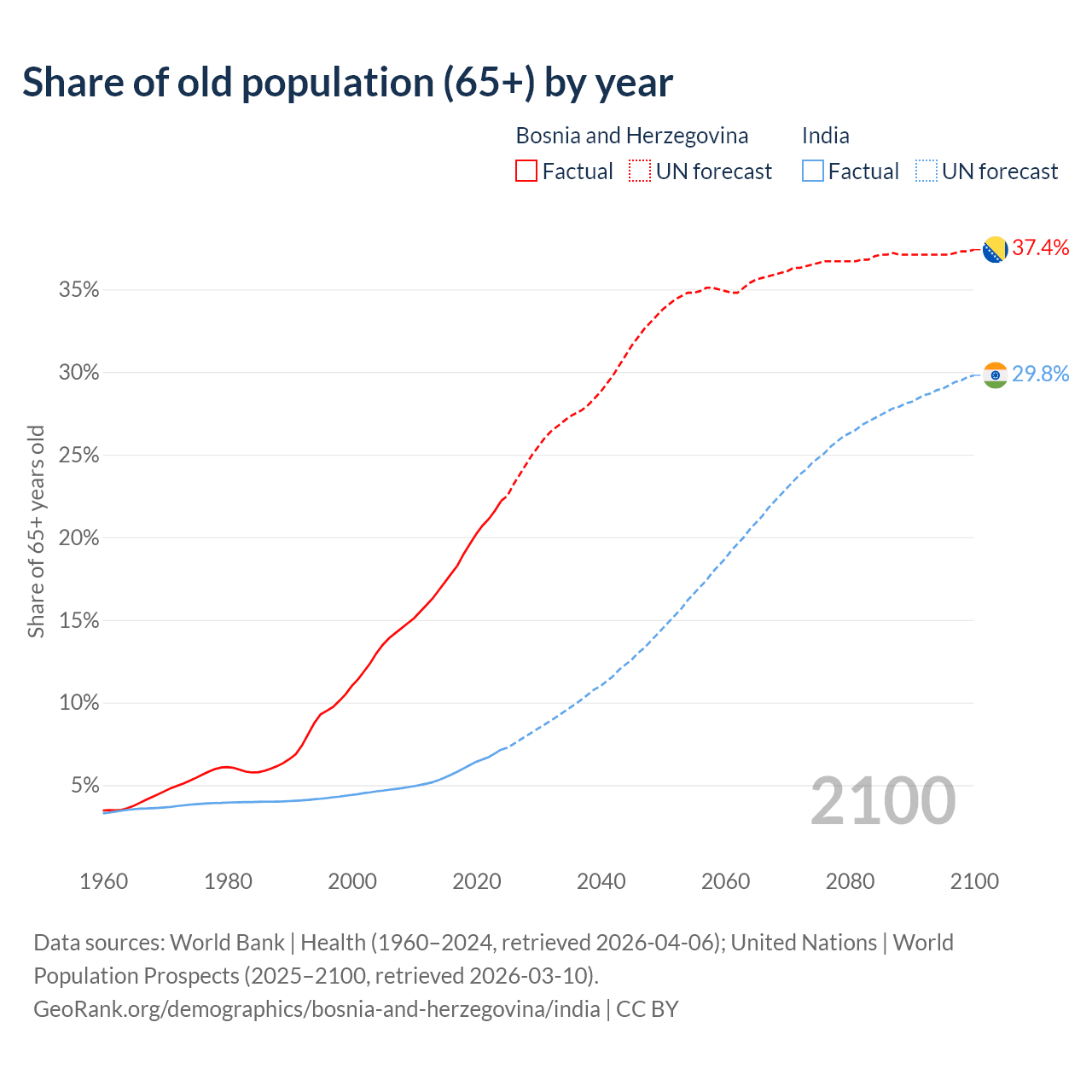 The share of older people aged 65 and over is 22.2% in Bosnia and Herzegovina and 7.15% in India. Life expectancy in Bosnia and Herzegovina compared to India .