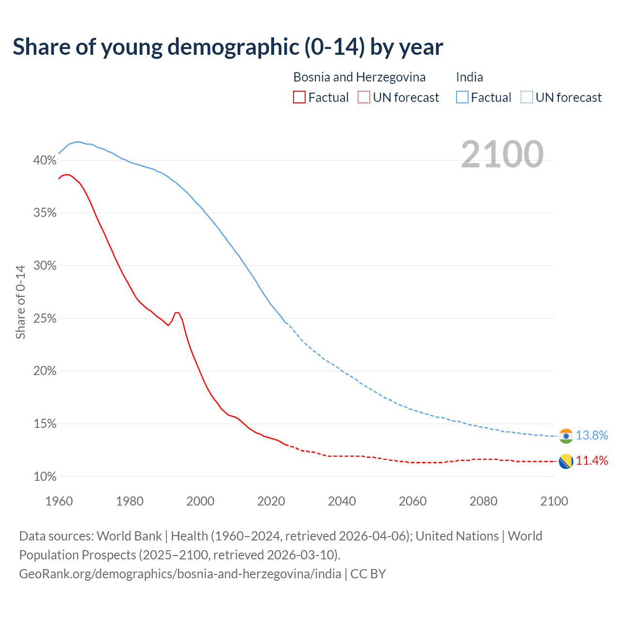 - The share of young demographic (0-15 years old) in Bosnia and Herzegovina is 13% vs 24.6% in India.