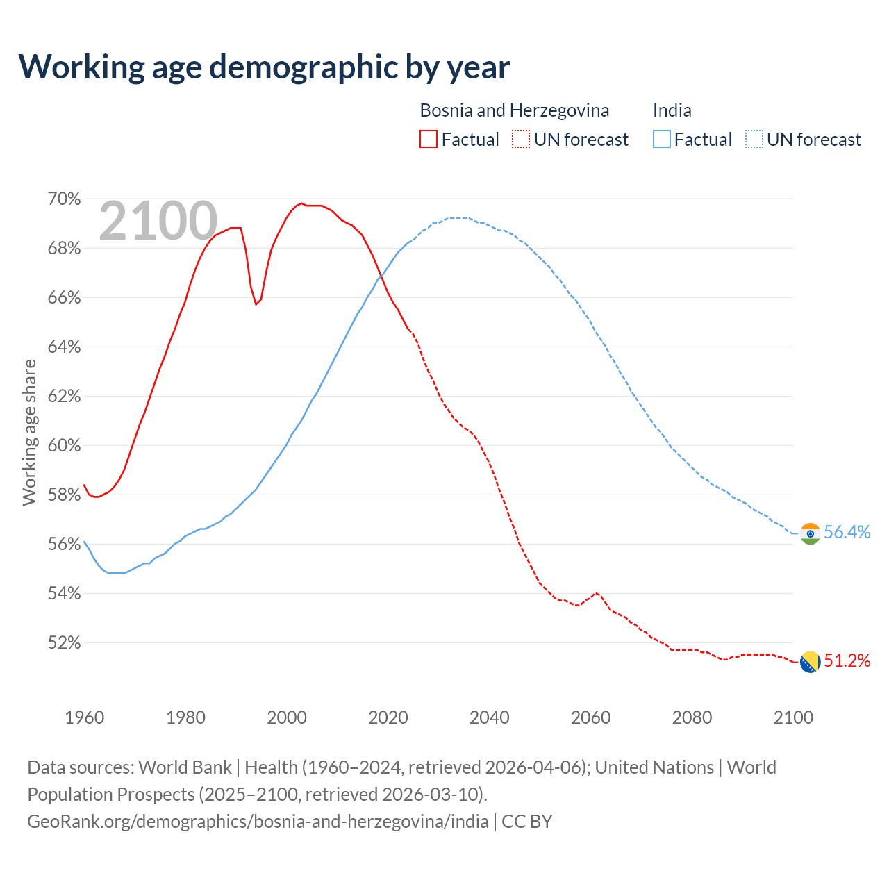 - Bosnia and Herzegovina has 2.02M working age adults (aged 15-64) vs 1.01B in India.