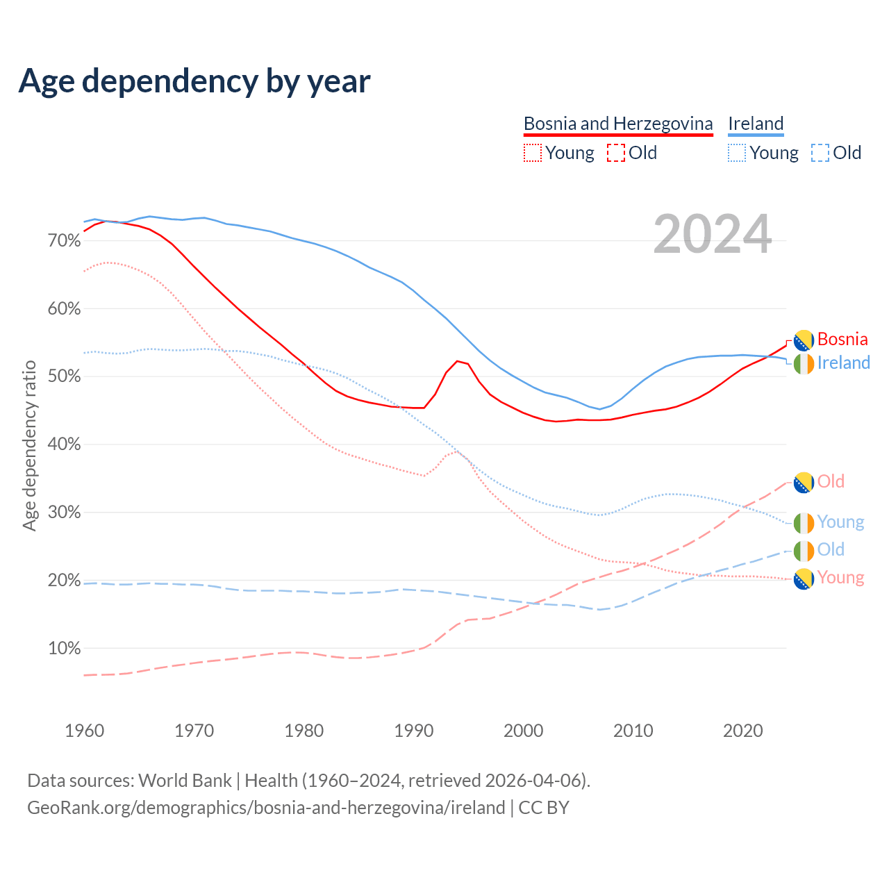 - Bosnia and Herzegovina is ranked 8/196 by median age (oldest to youngest) vs 48/196 for Ireland.