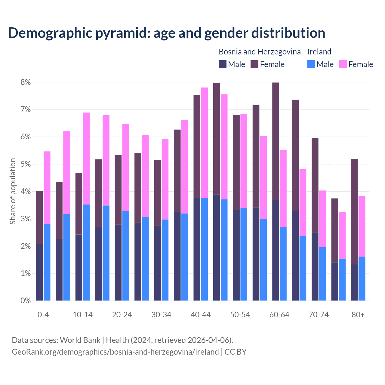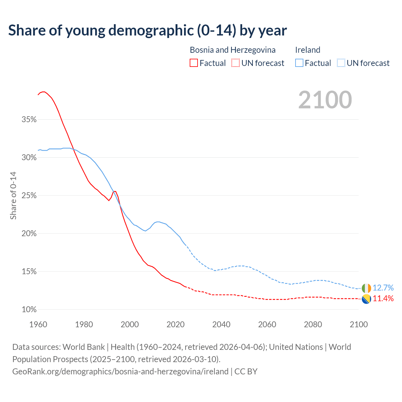 - The share of young demographic (0-15 years old) in Bosnia and Herzegovina is 13% vs 18.6% in Ireland.