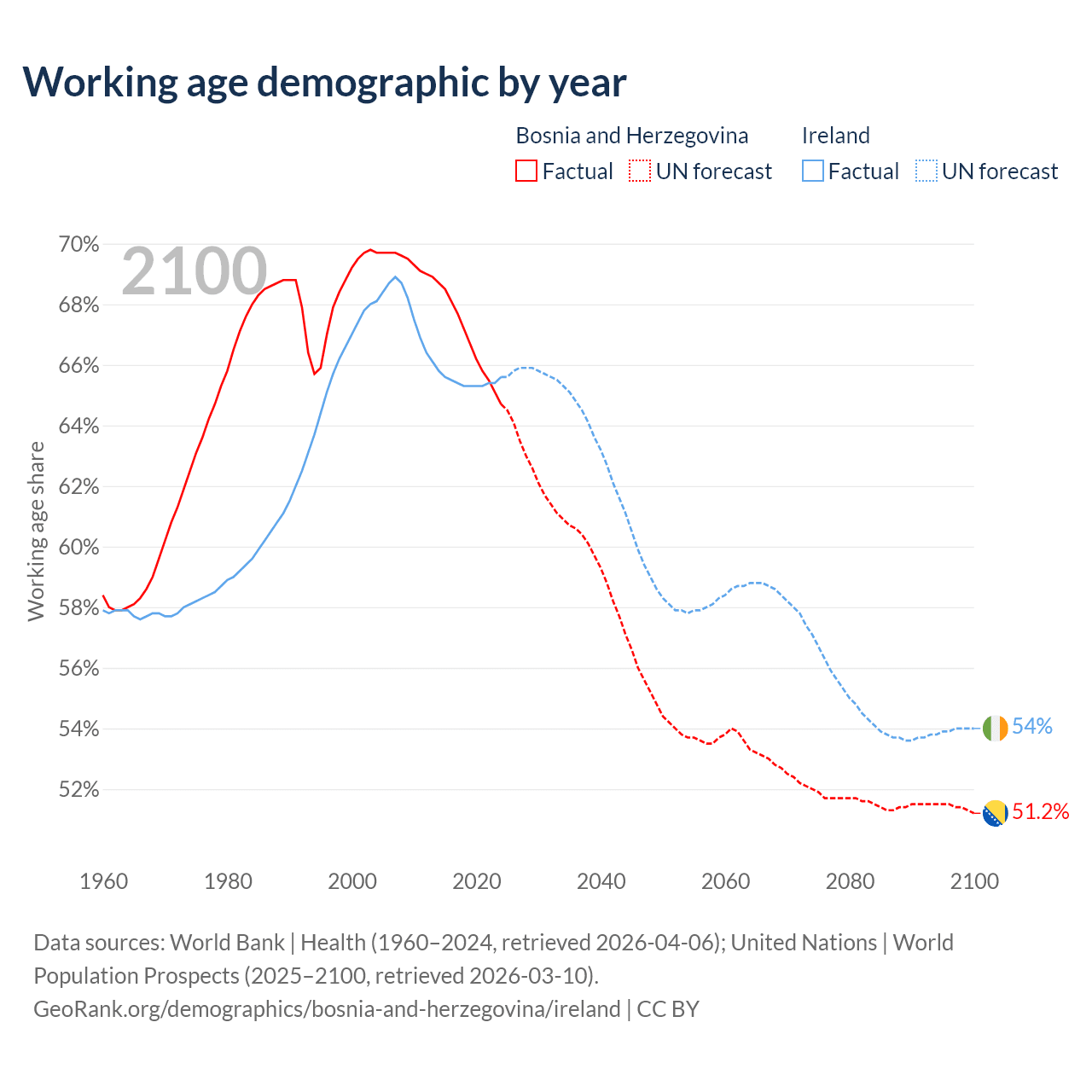 Median age Bosnia and Herzegovina vs Ireland, 1960-2100