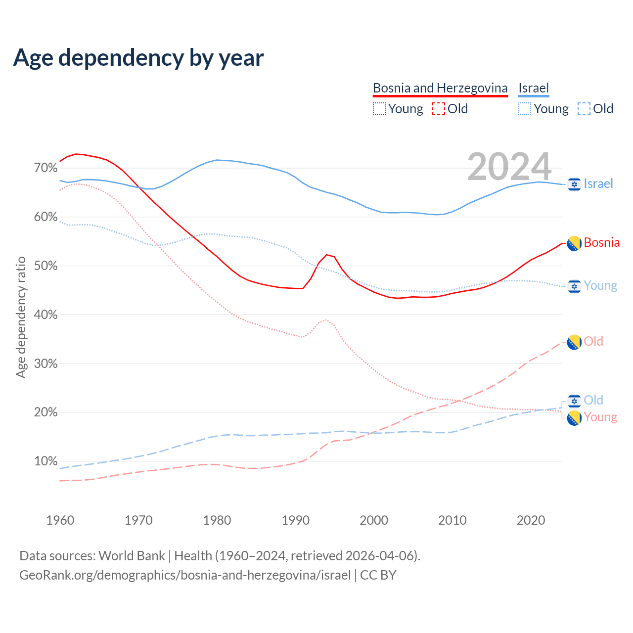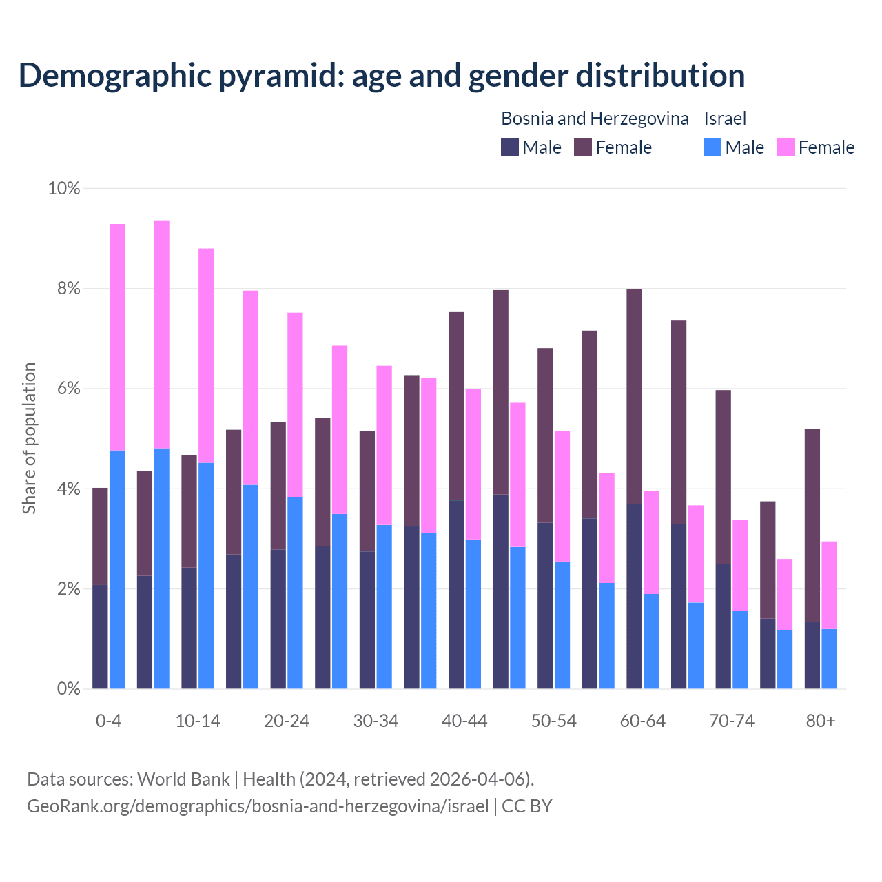 - Bosnia and Herzegovina is ranked 8/196 by median age (oldest to youngest) vs 103/196 for Israel.