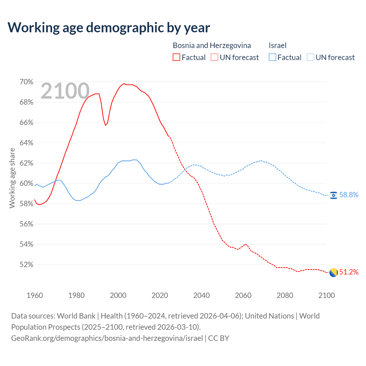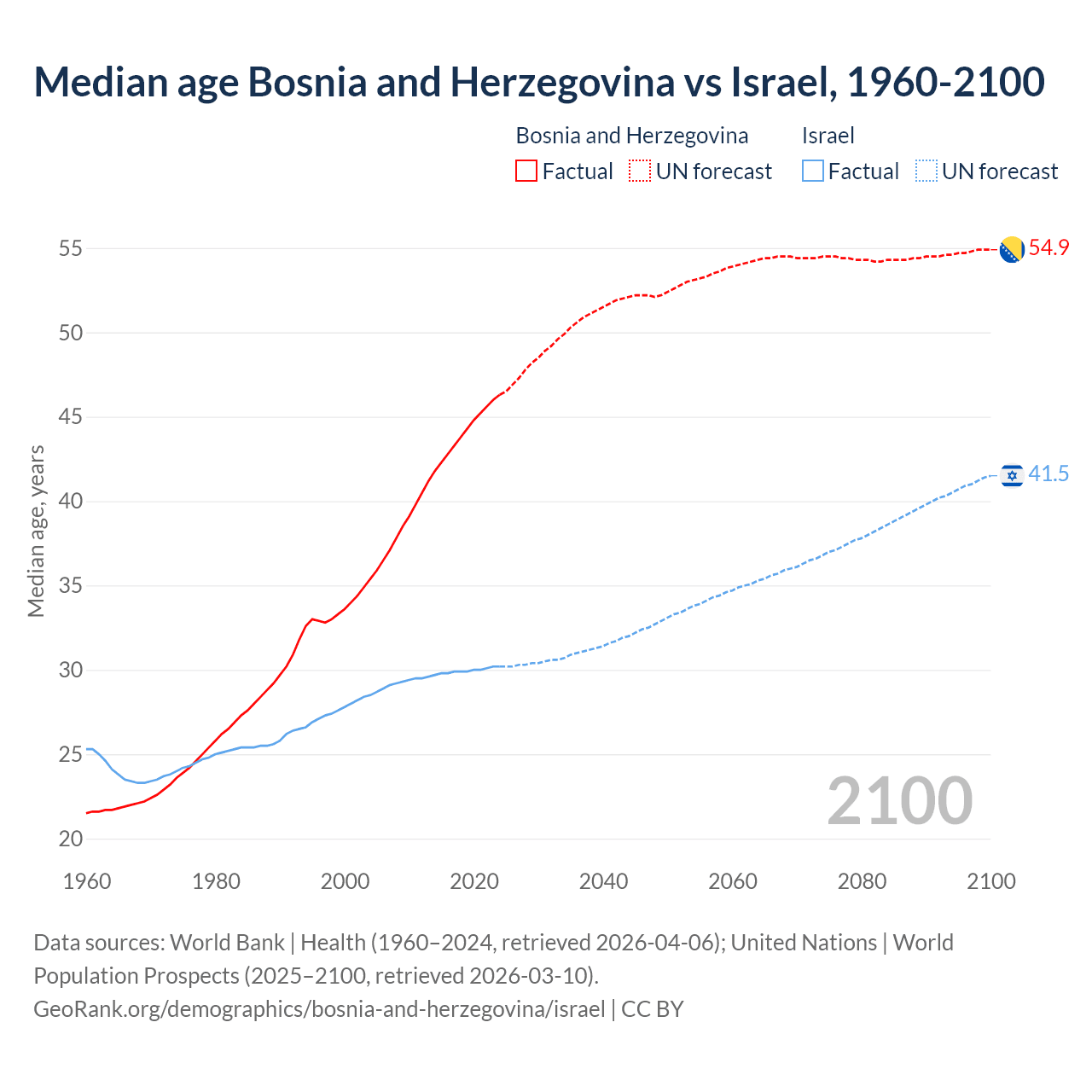 Median age Bosnia and Herzegovina vs Israel, 1960-2100