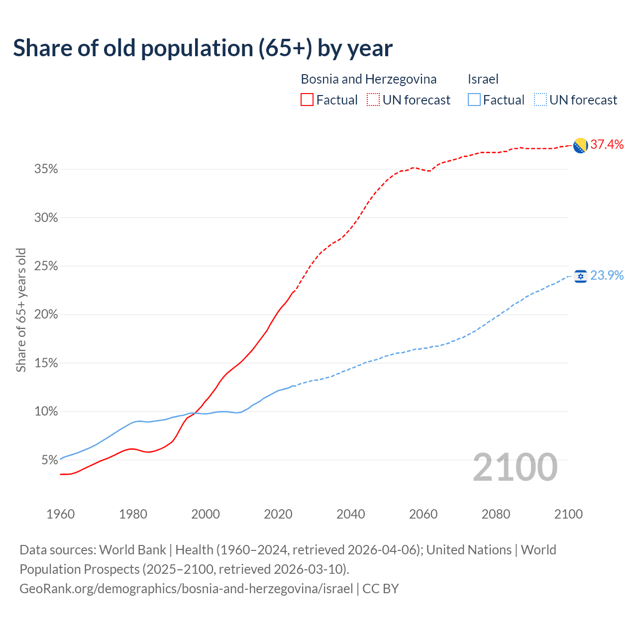 - The share of old-age demographic (65+) in Bosnia and Herzegovina is 22.2% vs 12.6% in Israel.