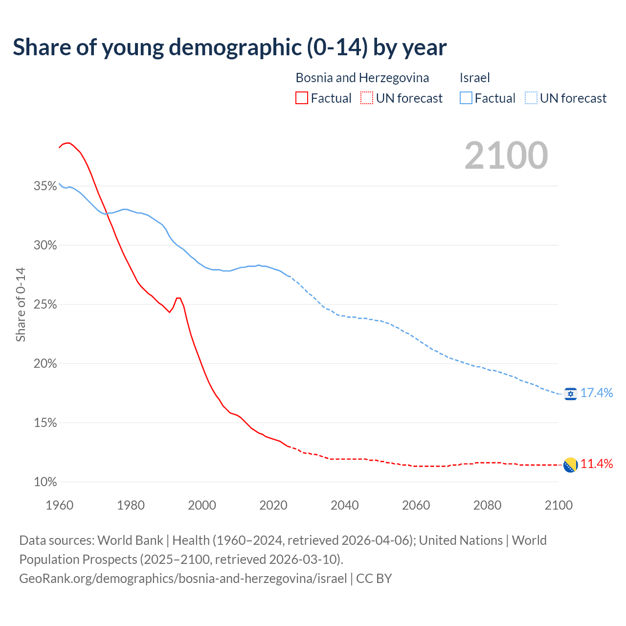 - The share of young demographic (0-15 years old) in Bosnia and Herzegovina is 13% vs 27.4% in Israel.