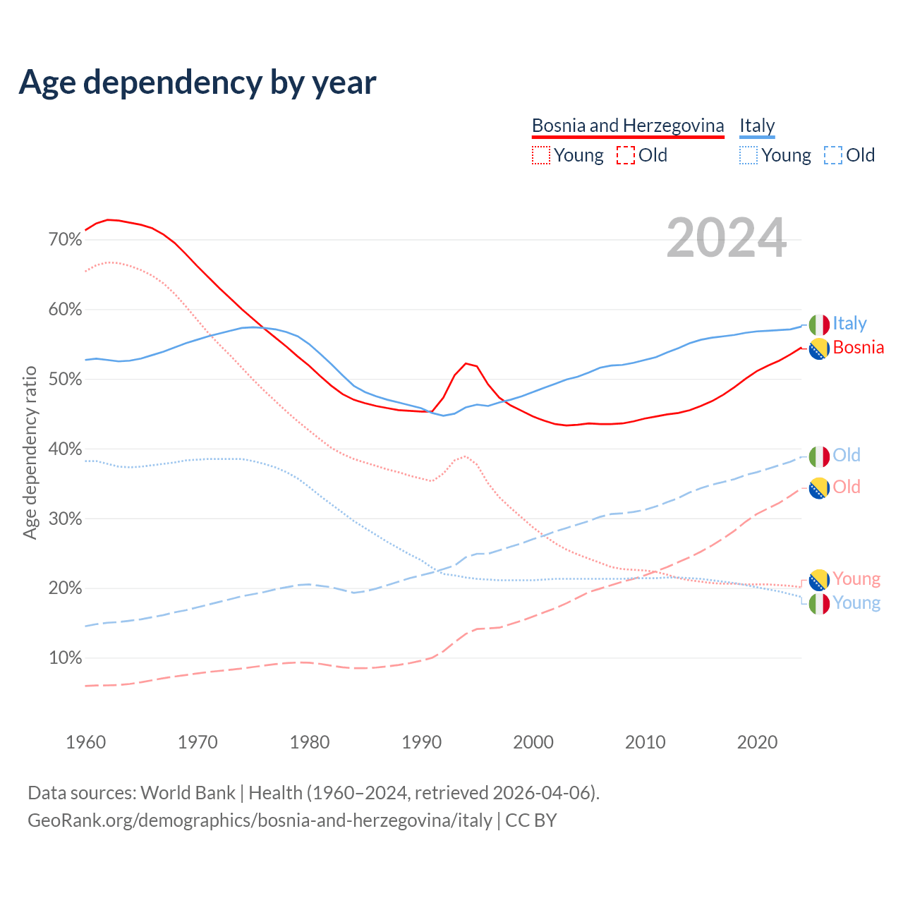 - Bosnia and Herzegovina is ranked 8/196 by median age (oldest to youngest) vs 4/196 for Italy.