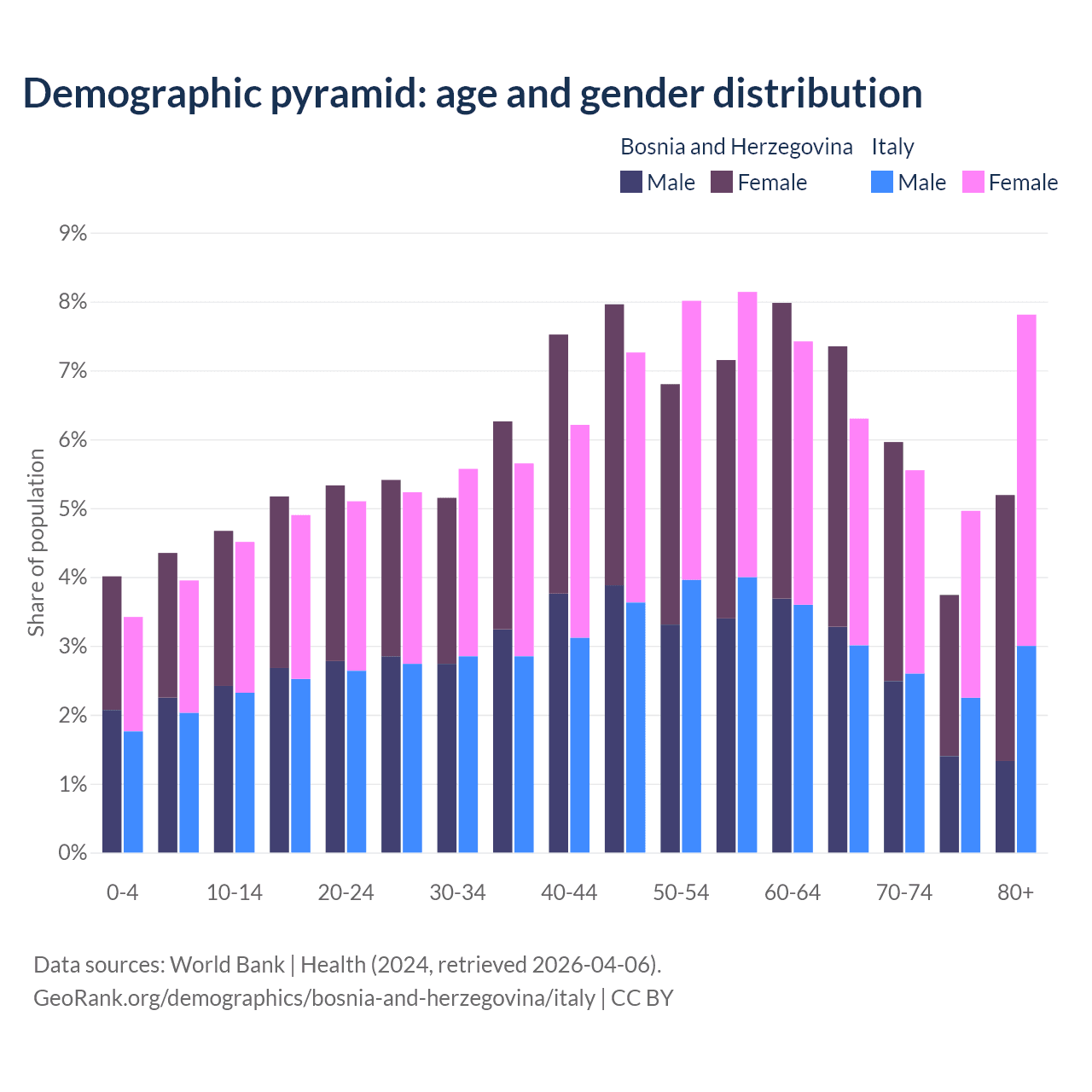 The share of older people aged 65 and over is 22.2% in Bosnia and Herzegovina and 24.6% in Italy. Life expectancy in Bosnia and Herzegovina compared to Italy .