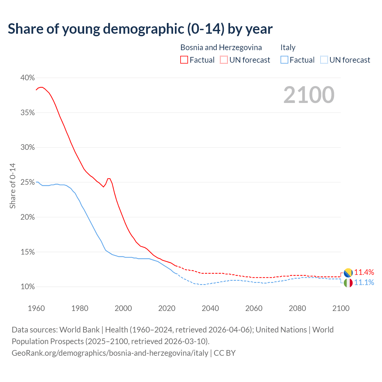 - The share of young demographic (0-15 years old) in Bosnia and Herzegovina is 13% vs 11.9% in Italy.