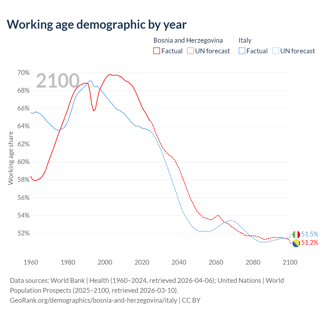 Median age Bosnia and Herzegovina vs Italy, 1960-2100