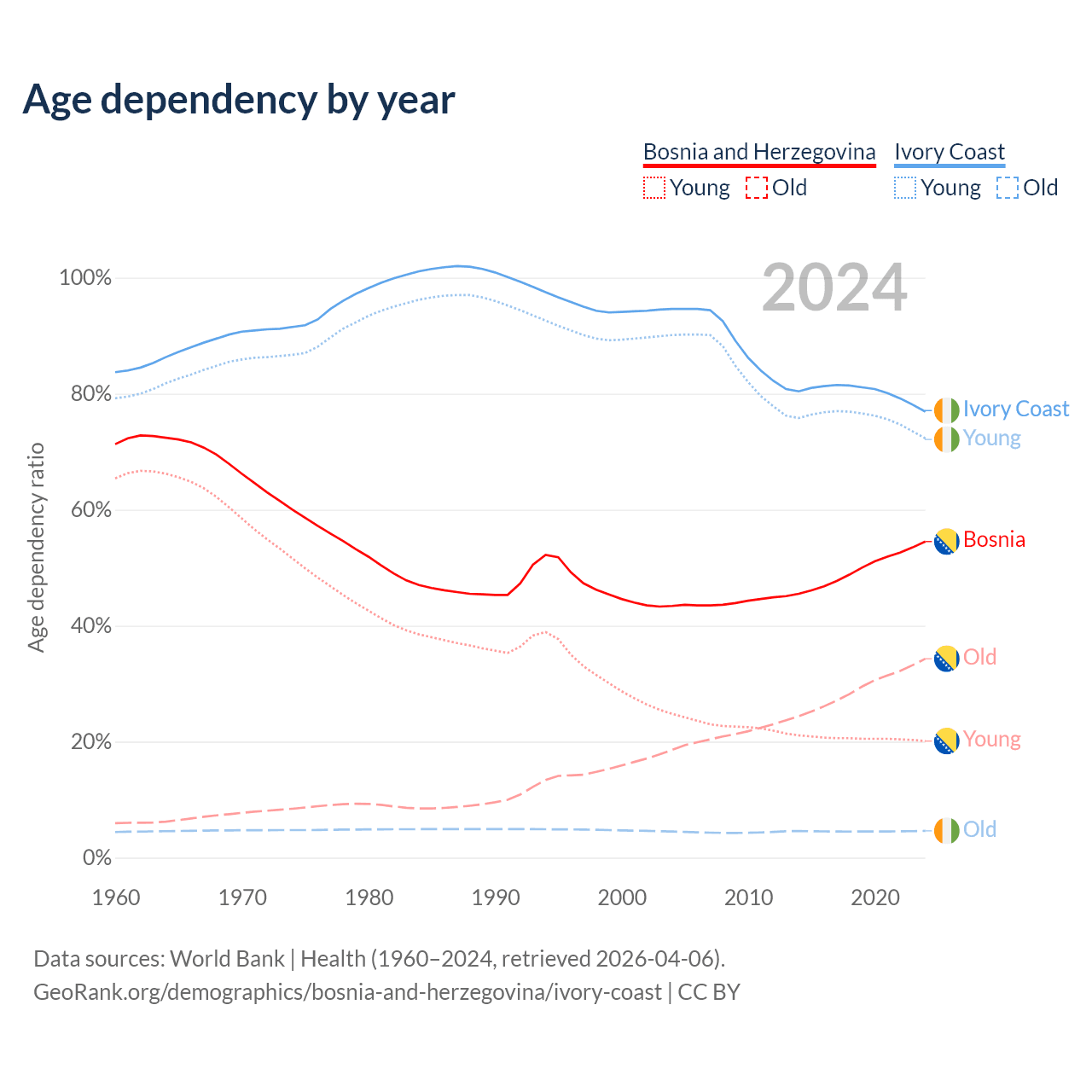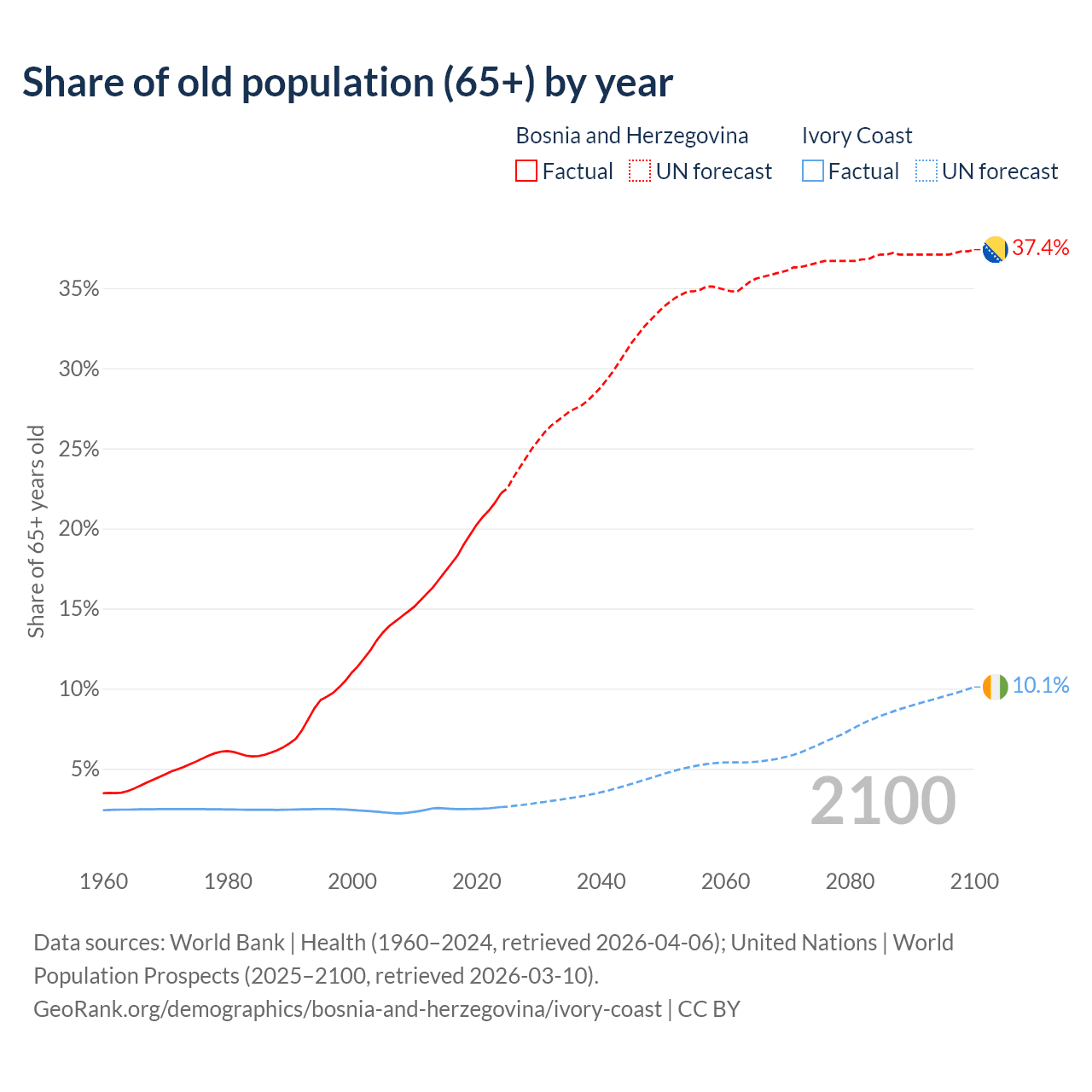 - The share of old-age demographic (65+) in Bosnia and Herzegovina is 22.2% vs 2.61% in Ivory Coast.