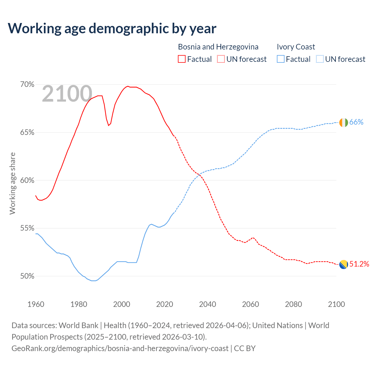 Median age Bosnia and Herzegovina vs Ivory Coast, 1960-2100