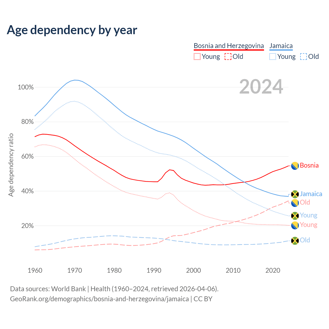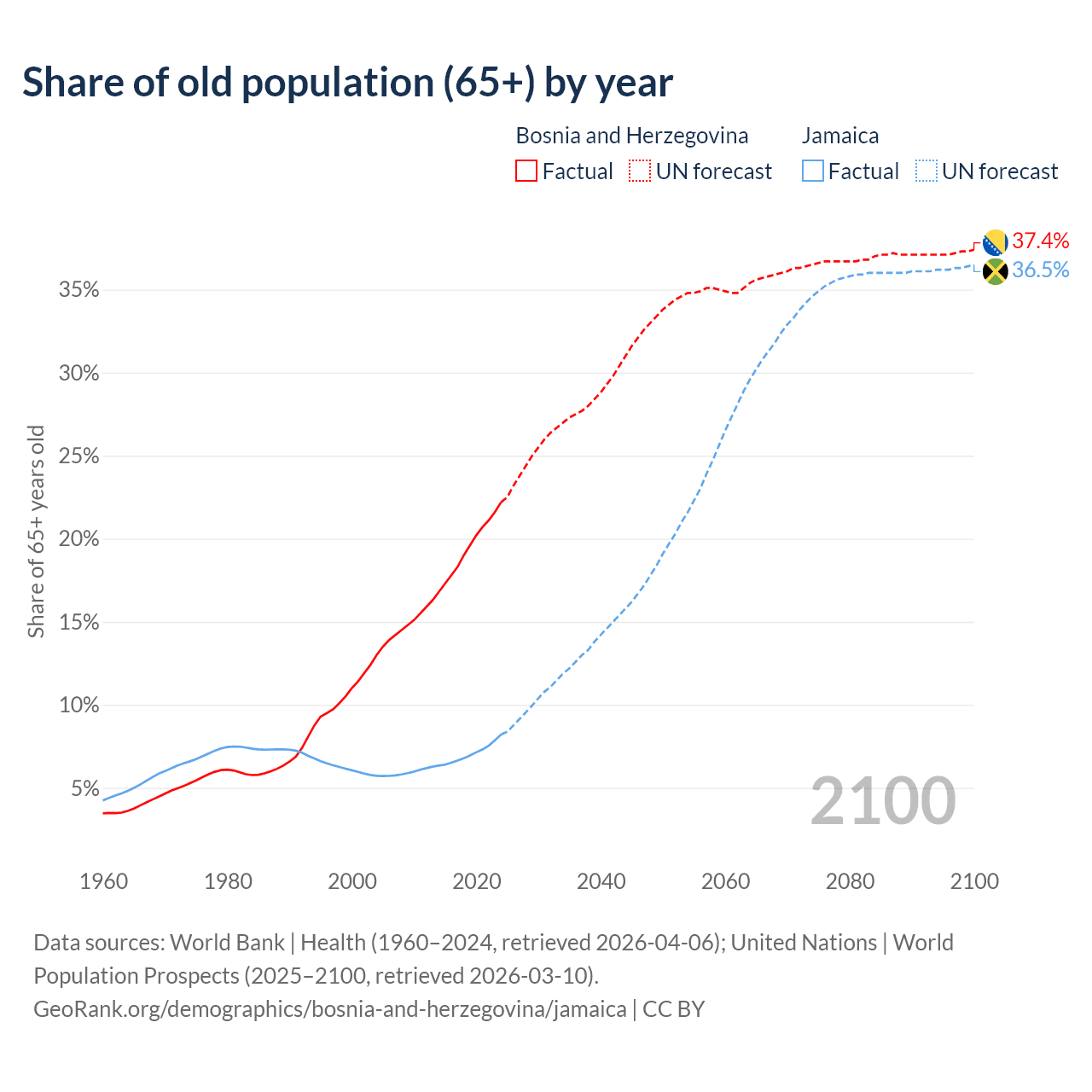 - The share of old-age demographic (65+) in Bosnia and Herzegovina is 22.2% vs 8.21% in Jamaica.