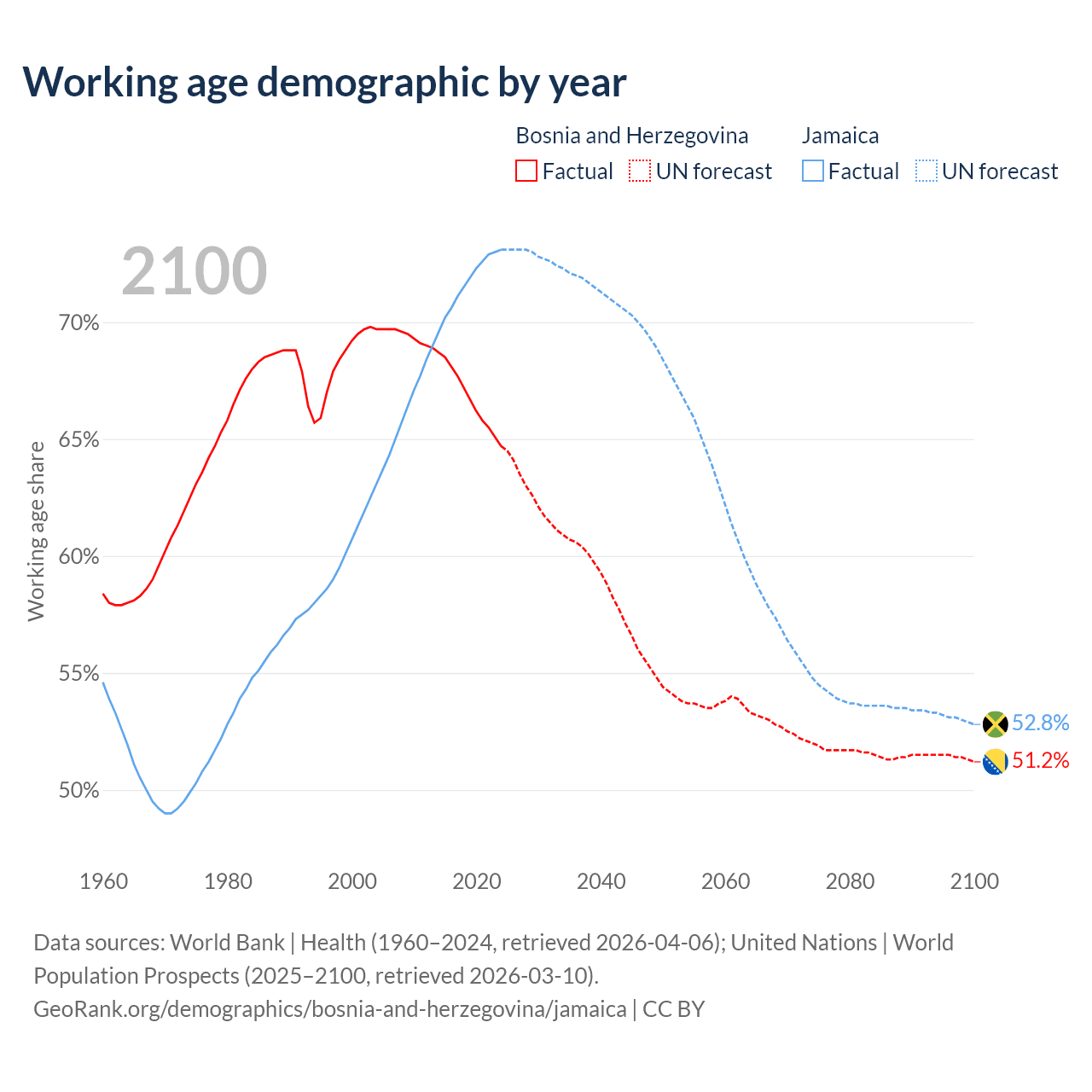 - Bosnia and Herzegovina has 2.02M working age adults (aged 15-64) vs 2.07M in Jamaica.
