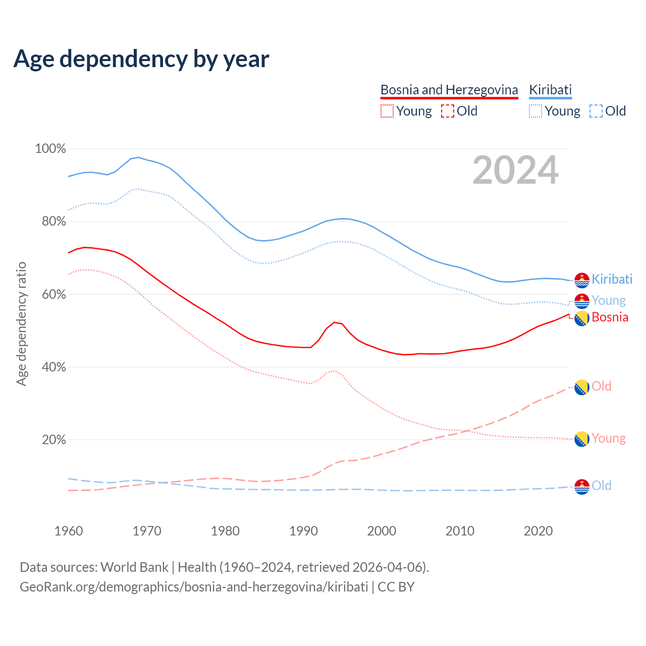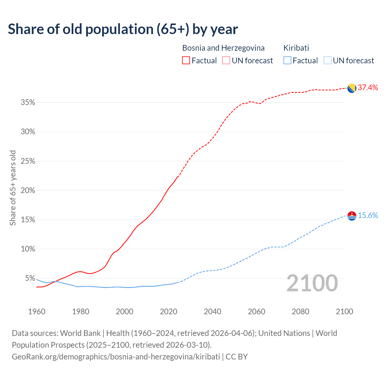 - The share of old-age demographic (65+) in Bosnia and Herzegovina is 22.2% vs 4.24% in Kiribati.