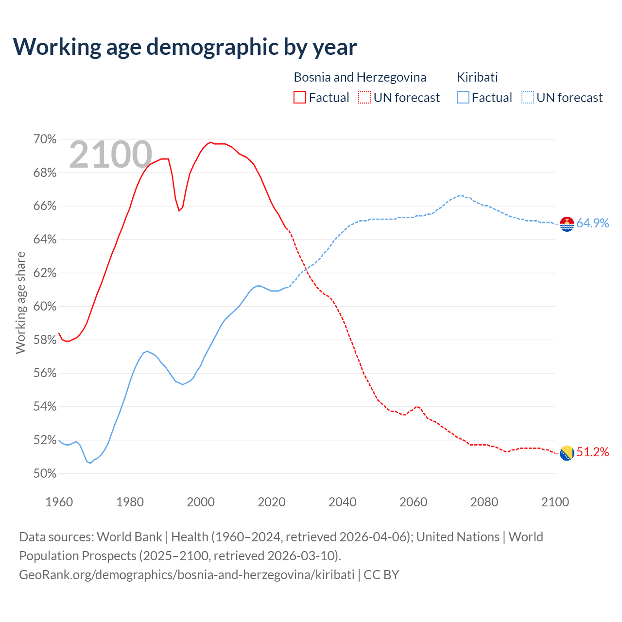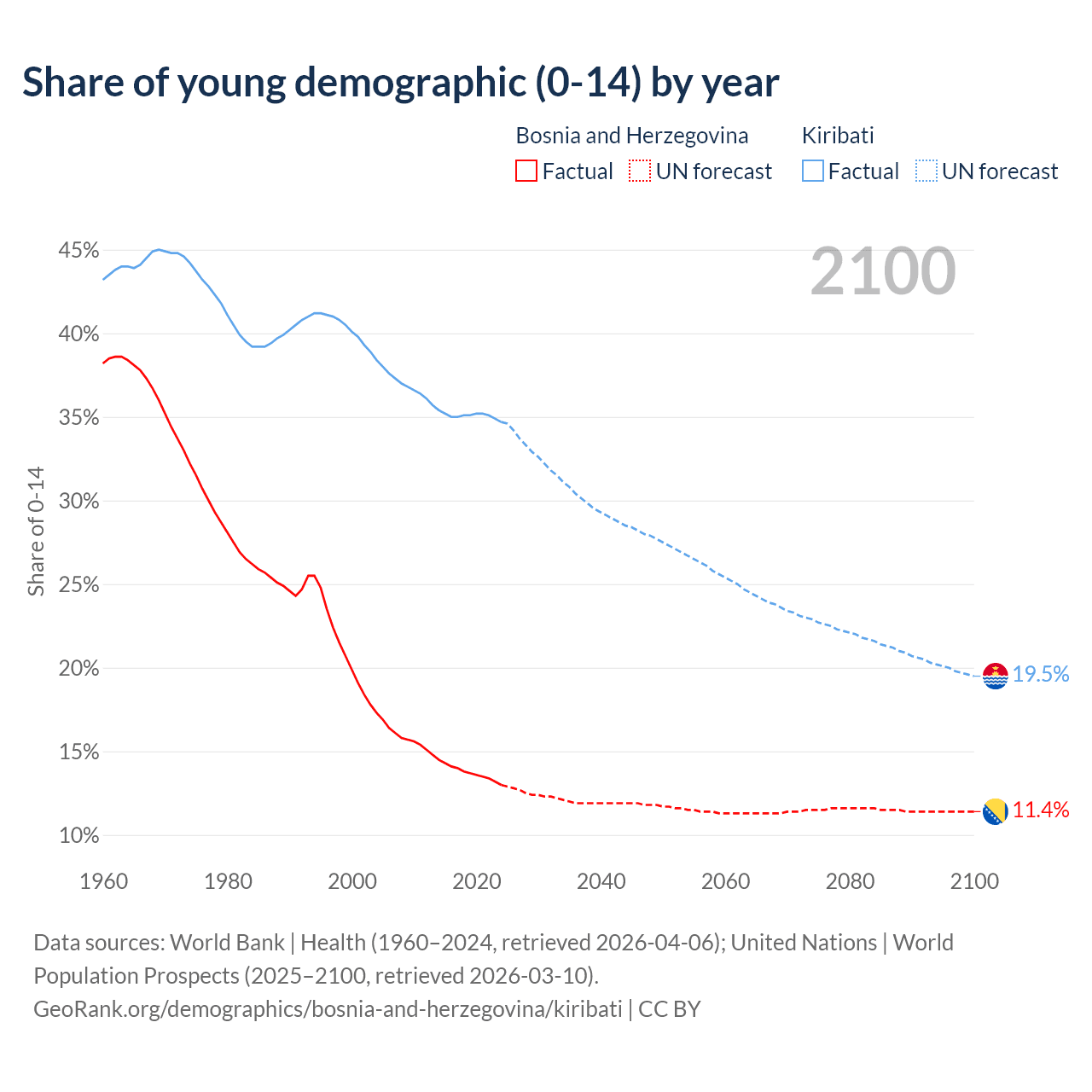 - The share of young demographic (0-15 years old) in Bosnia and Herzegovina is 13% vs 34.7% in Kiribati.