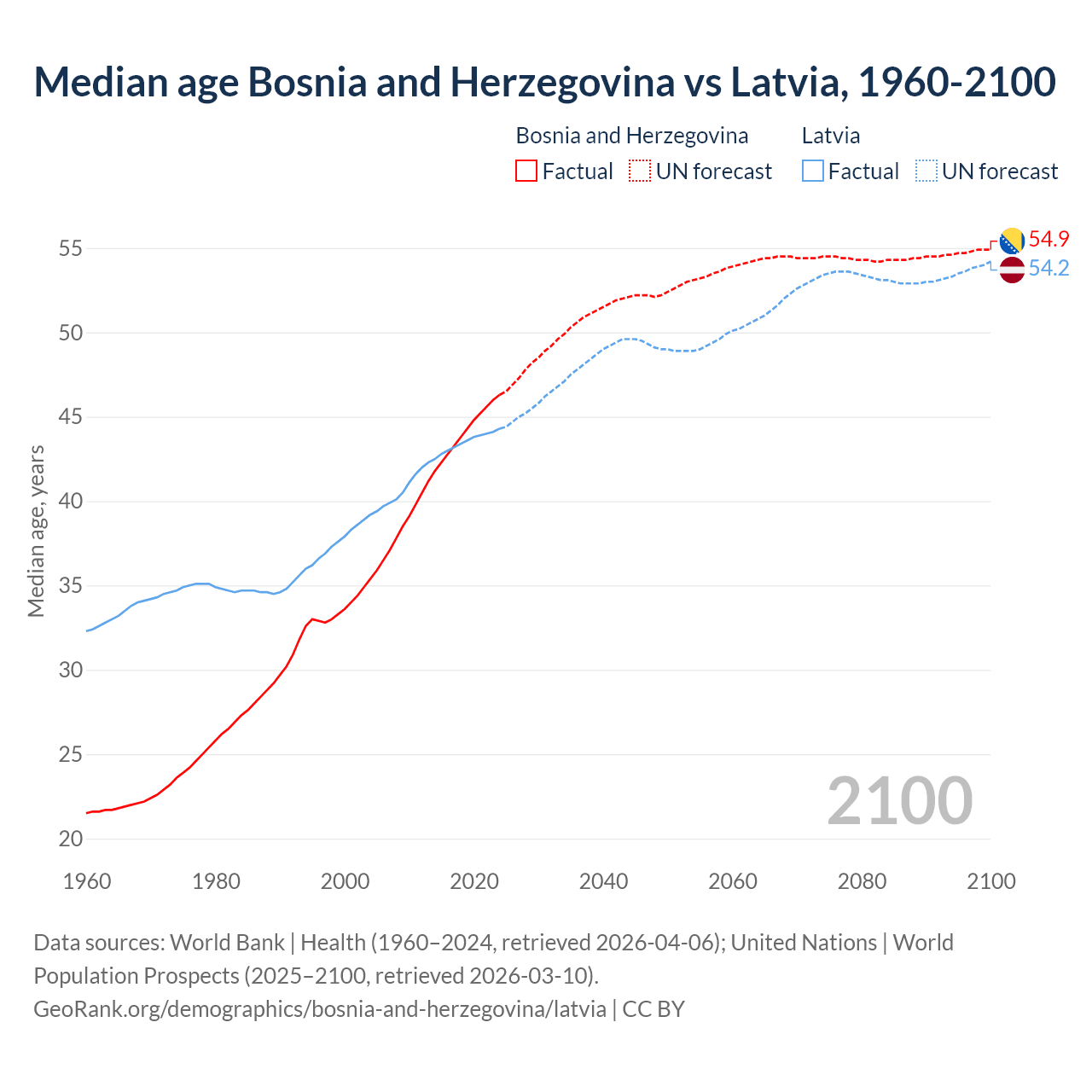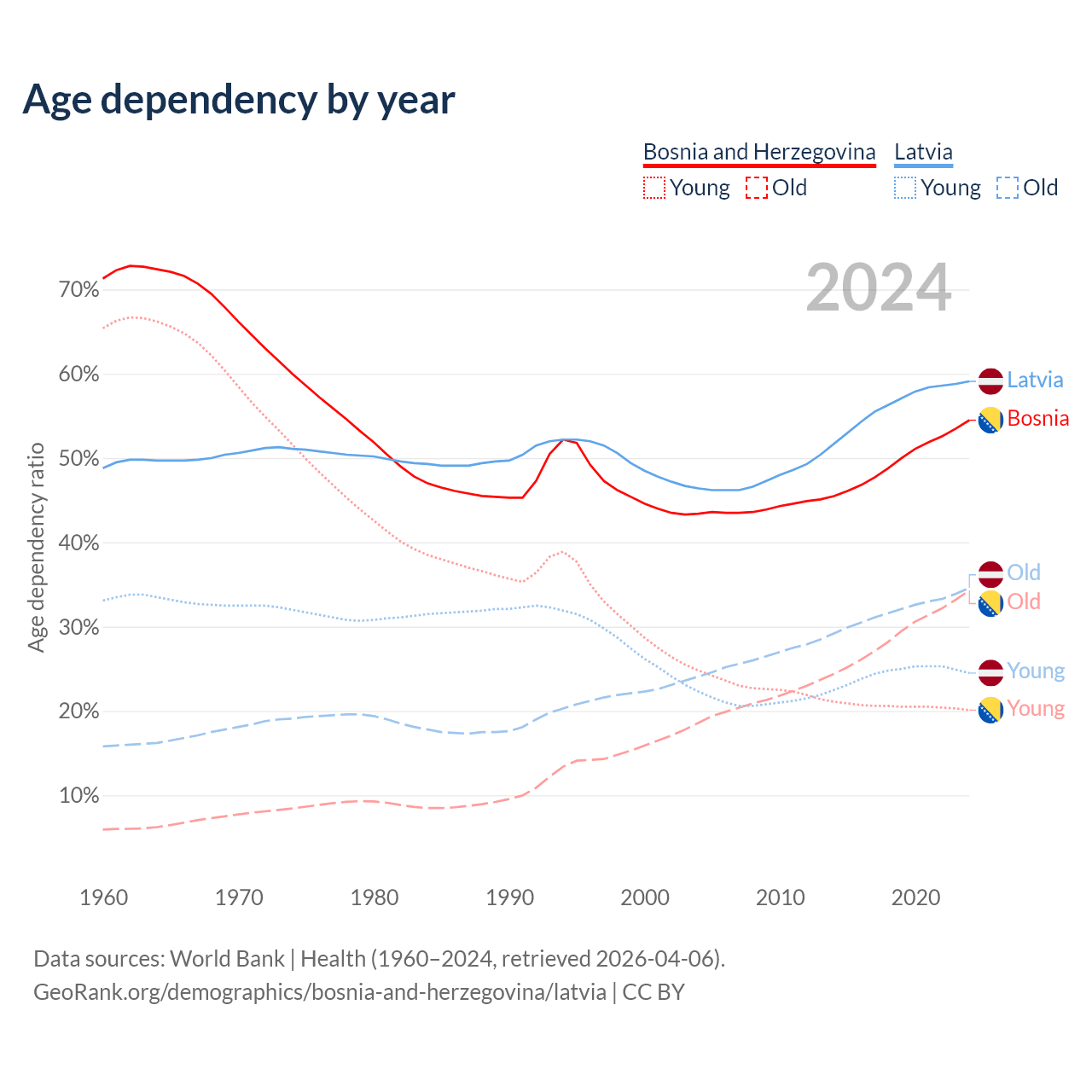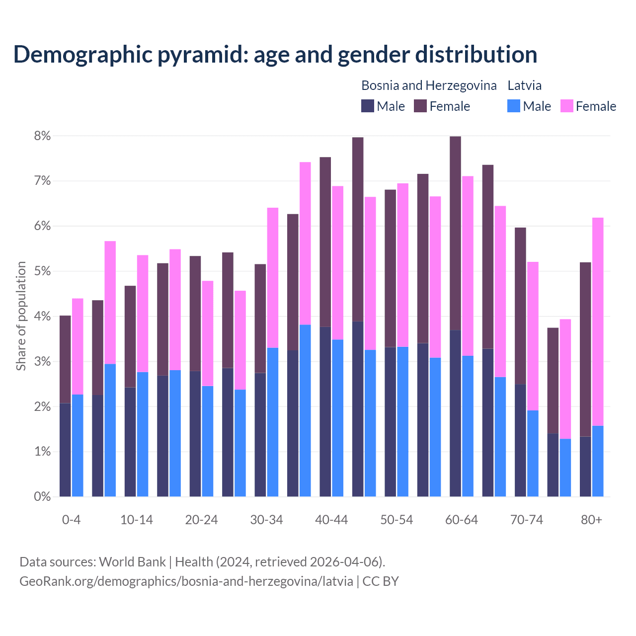 - Bosnia and Herzegovina is ranked 8/196 by median age (oldest to youngest) vs 20/196 for Latvia.
