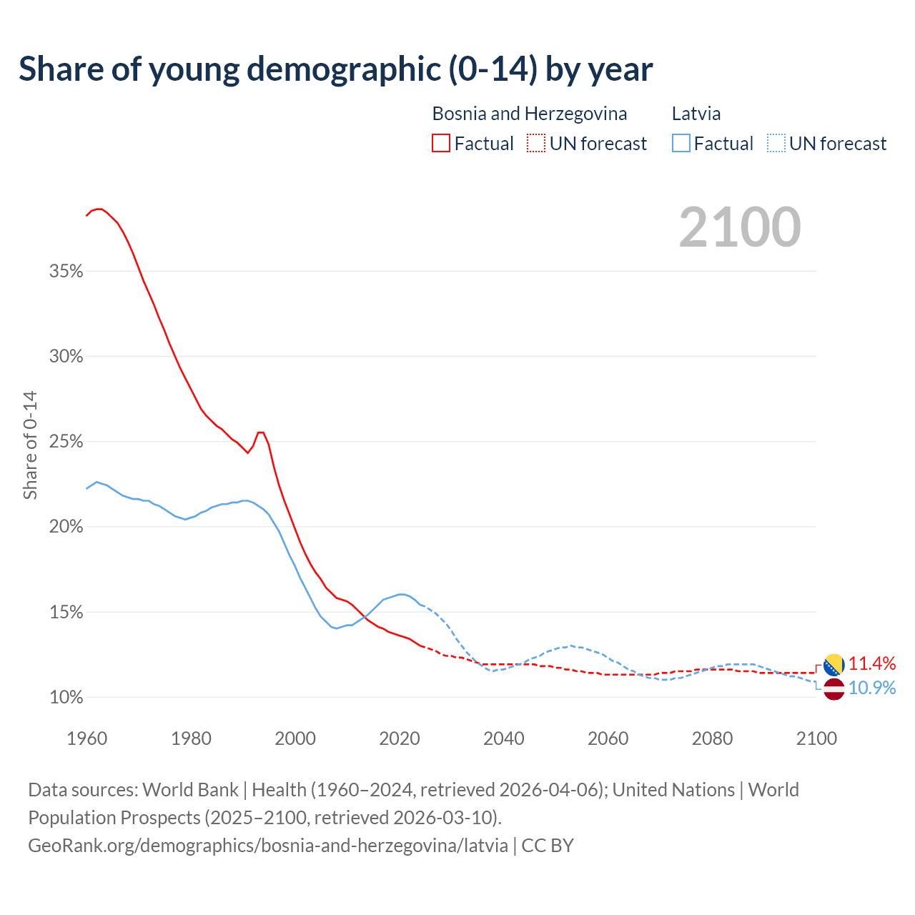 - The share of young demographic (0-15 years old) in Bosnia and Herzegovina is 13% vs 15.4% in Latvia.