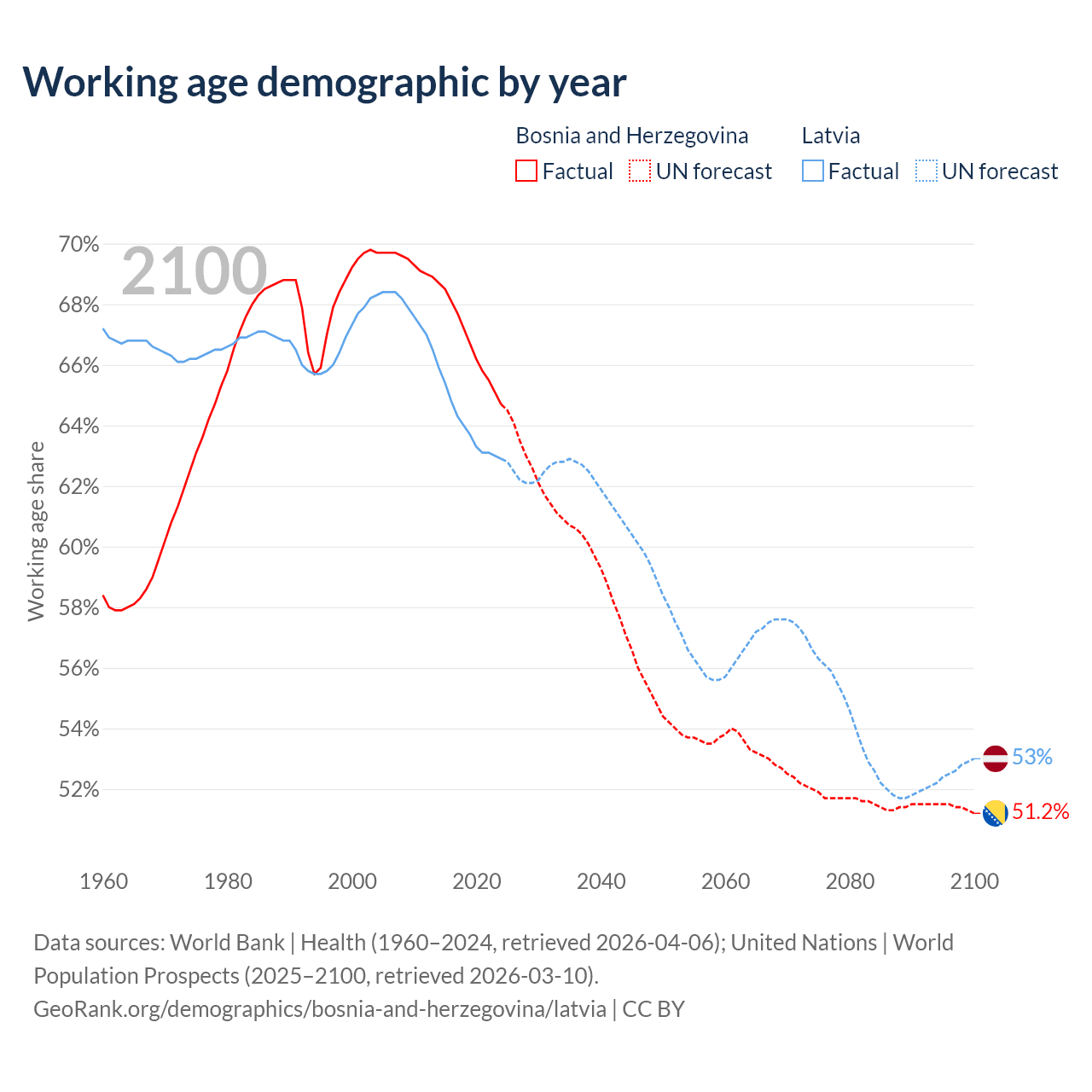 - Bosnia and Herzegovina has 2.02M working age adults (aged 15-64) vs 1.15M in Latvia.
