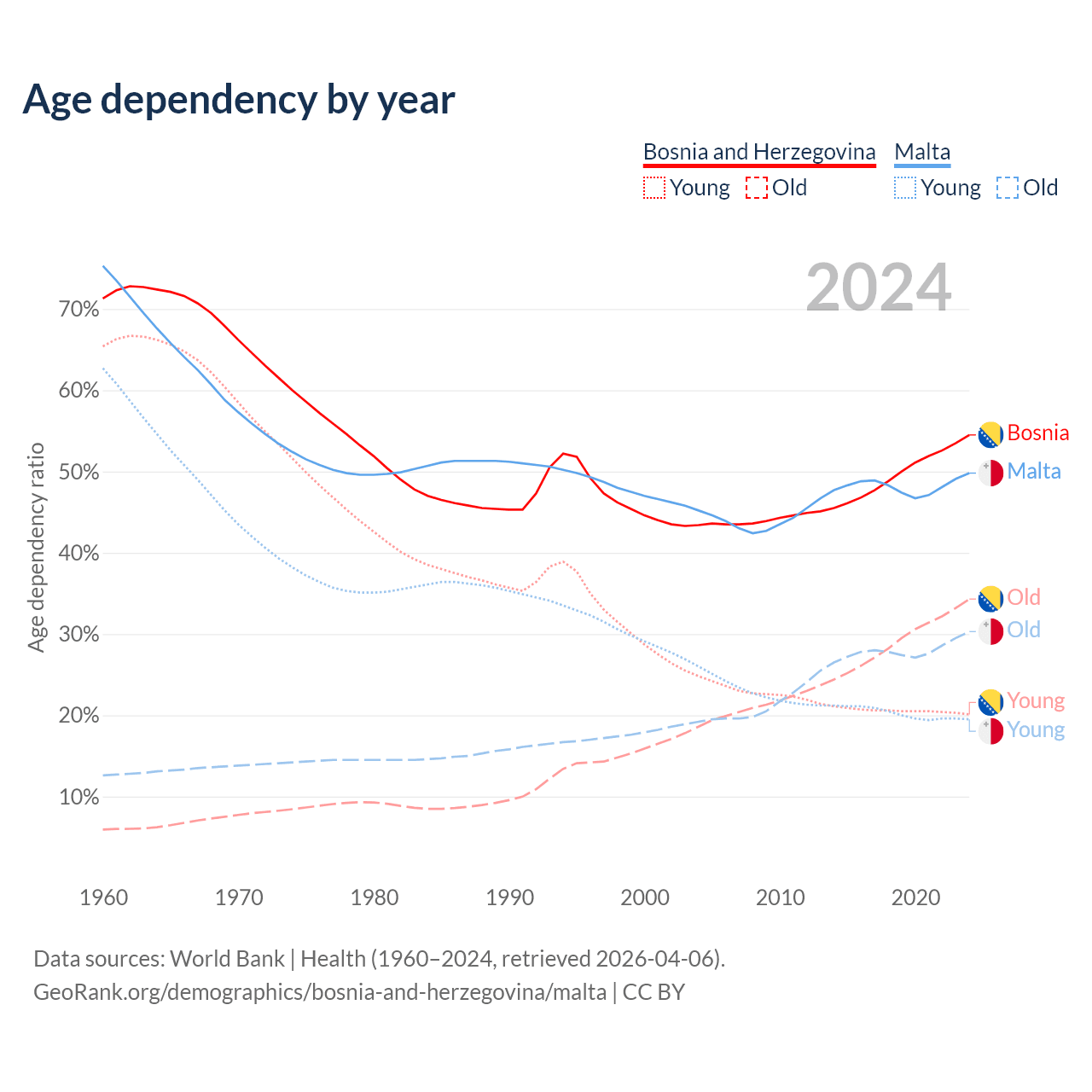 - Bosnia and Herzegovina is ranked 8/196 by median age (oldest to youngest) vs 36/196 for Malta.