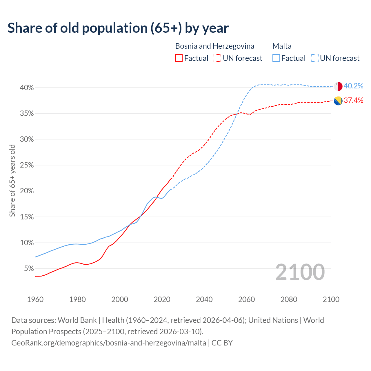 - The share of old-age demographic (65+) in Bosnia and Herzegovina is 22.2% vs 20.2% in Malta.