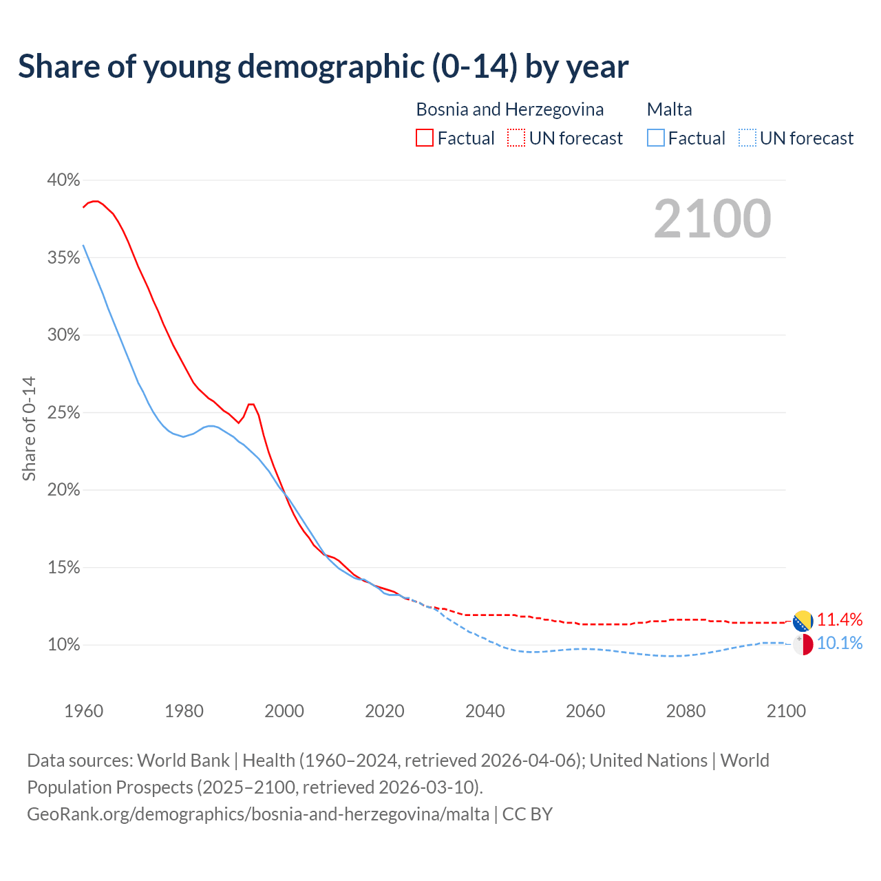 - The share of young demographic (0-15 years old) in Bosnia and Herzegovina is 13% vs 13% in Malta.