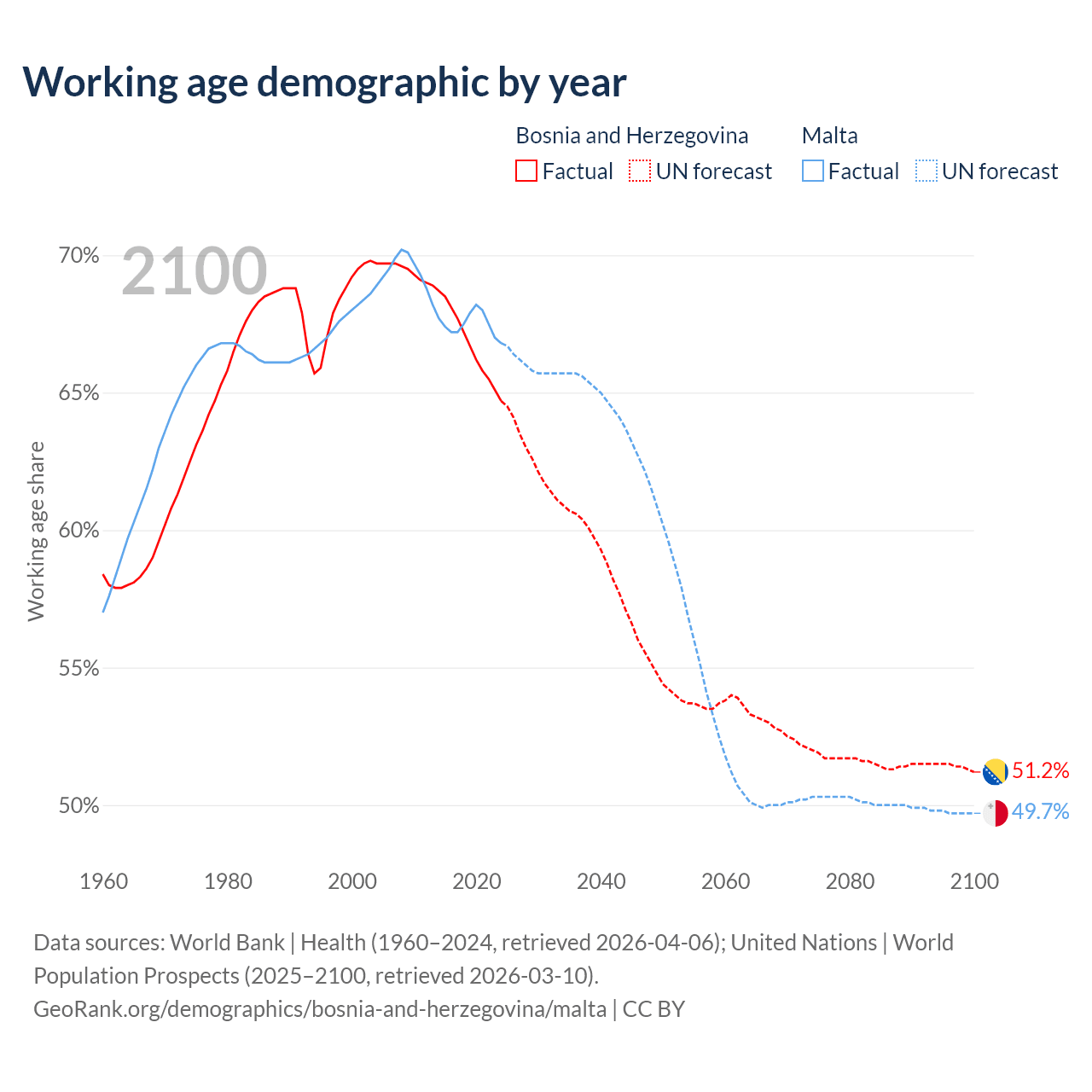 - Bosnia and Herzegovina has 2.02M working age adults (aged 15-64) vs 388K in Malta.