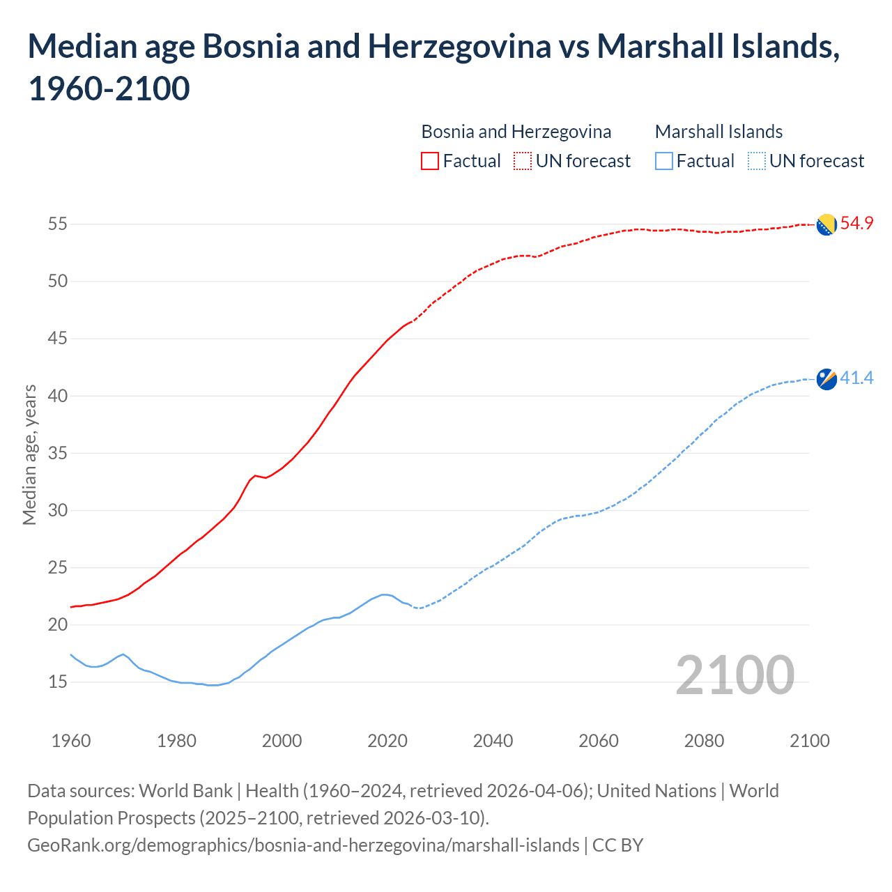 Median age Bosnia and Herzegovina vs Marshall Islands, 1960-2100