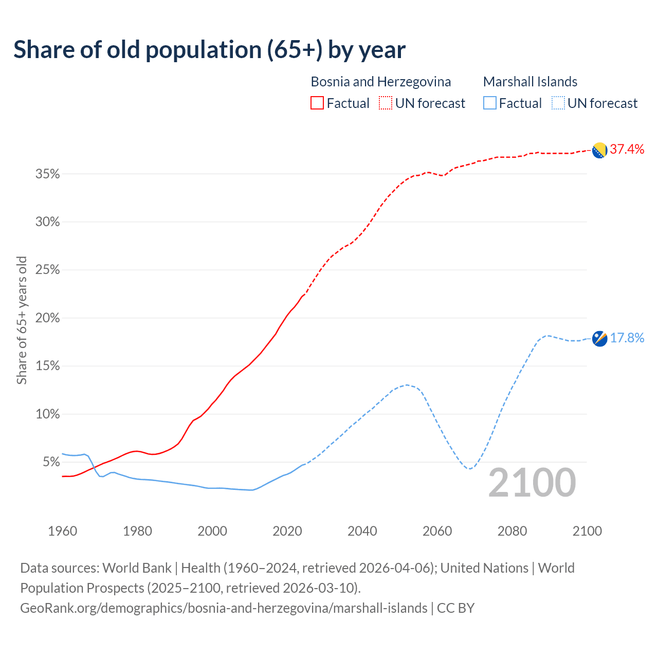 - The share of old-age demographic (65+) in Bosnia and Herzegovina is 22.2% vs 4.64% in the Marshall Islands.