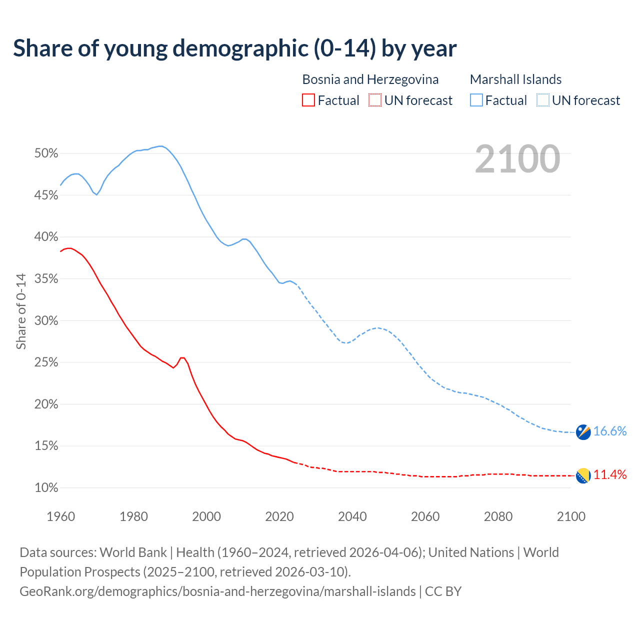 - The share of young demographic (0-15 years old) in Bosnia and Herzegovina is 13% vs 34.5% in the Marshall Islands.