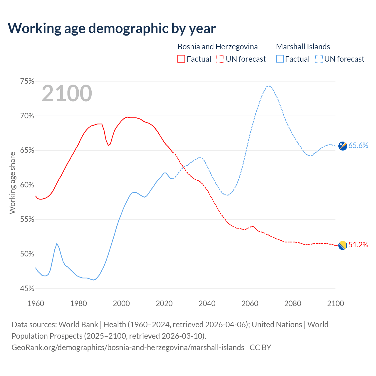 - Bosnia and Herzegovina has 2.02M working age adults (aged 15-64) vs 21.3K in the Marshall Islands.