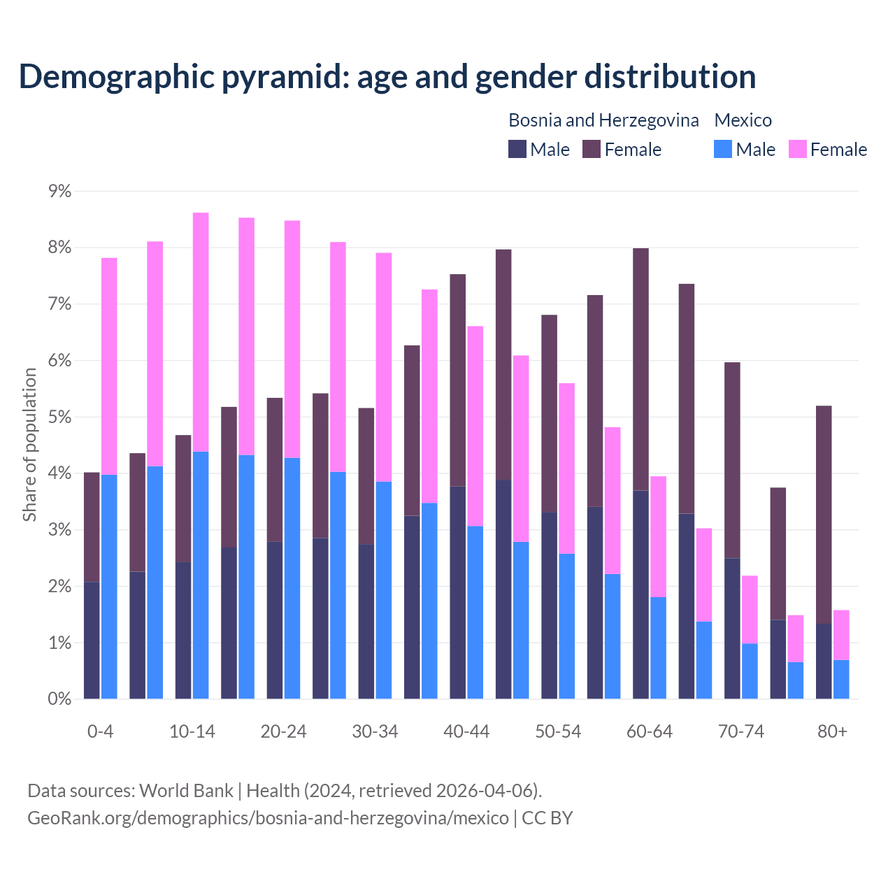 - Bosnia and Herzegovina is ranked 8/196 by median age (oldest to youngest) vs 102/196 for Mexico.