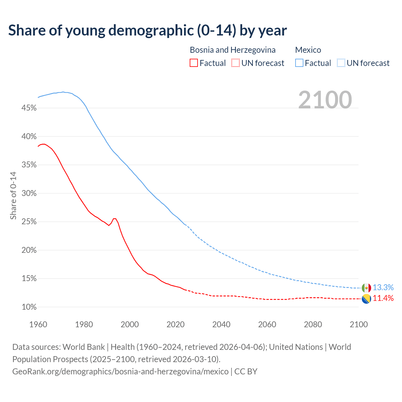 - The share of young demographic (0-15 years old) in Bosnia and Herzegovina is 13% vs 24.5% in Mexico.